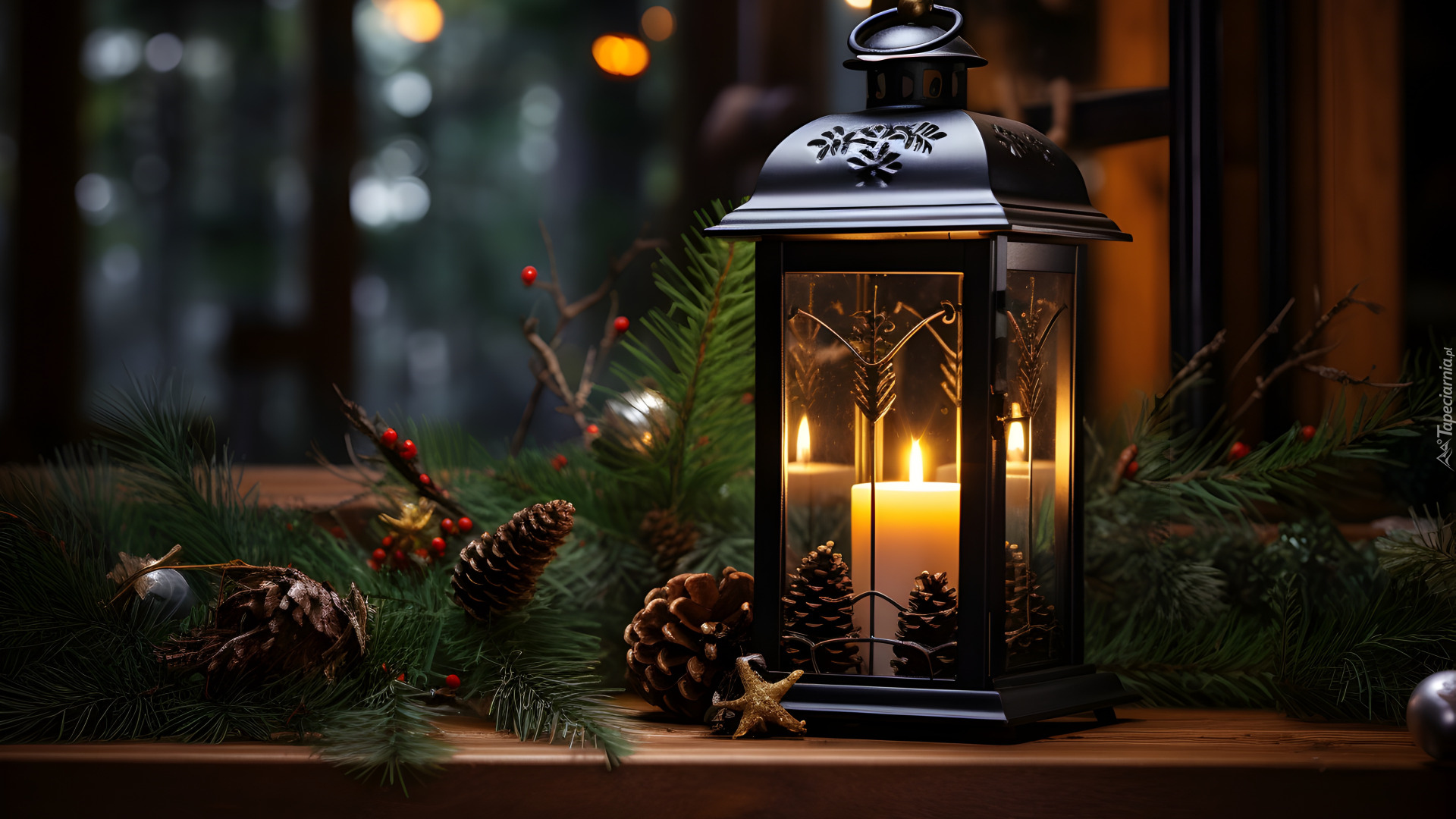 Edytor tapety: Lampion z zapaloną świecą obok gałązek i szyszek