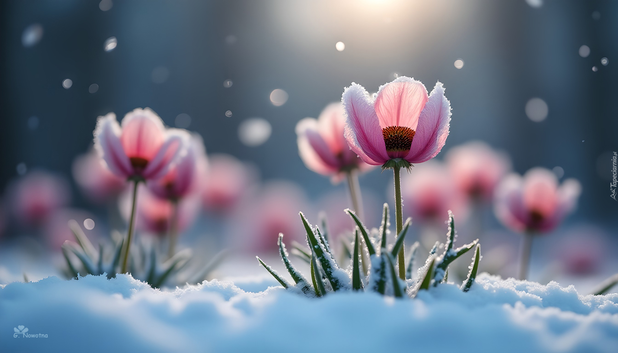 Edytor tapety: Rozświetlone różowe kwiaty w śniegu