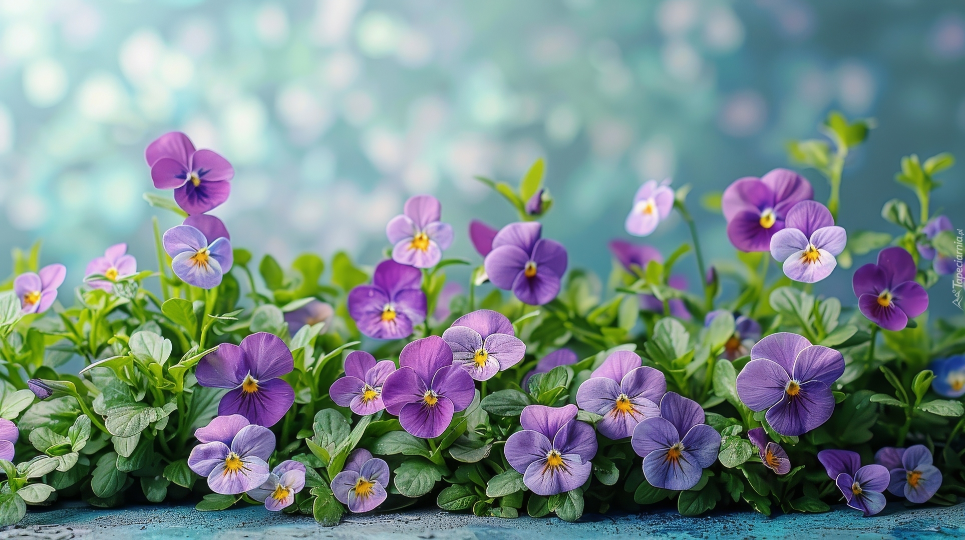 Edytor tapety: Rozkwitnięte fioletowe bratki z liśćmi