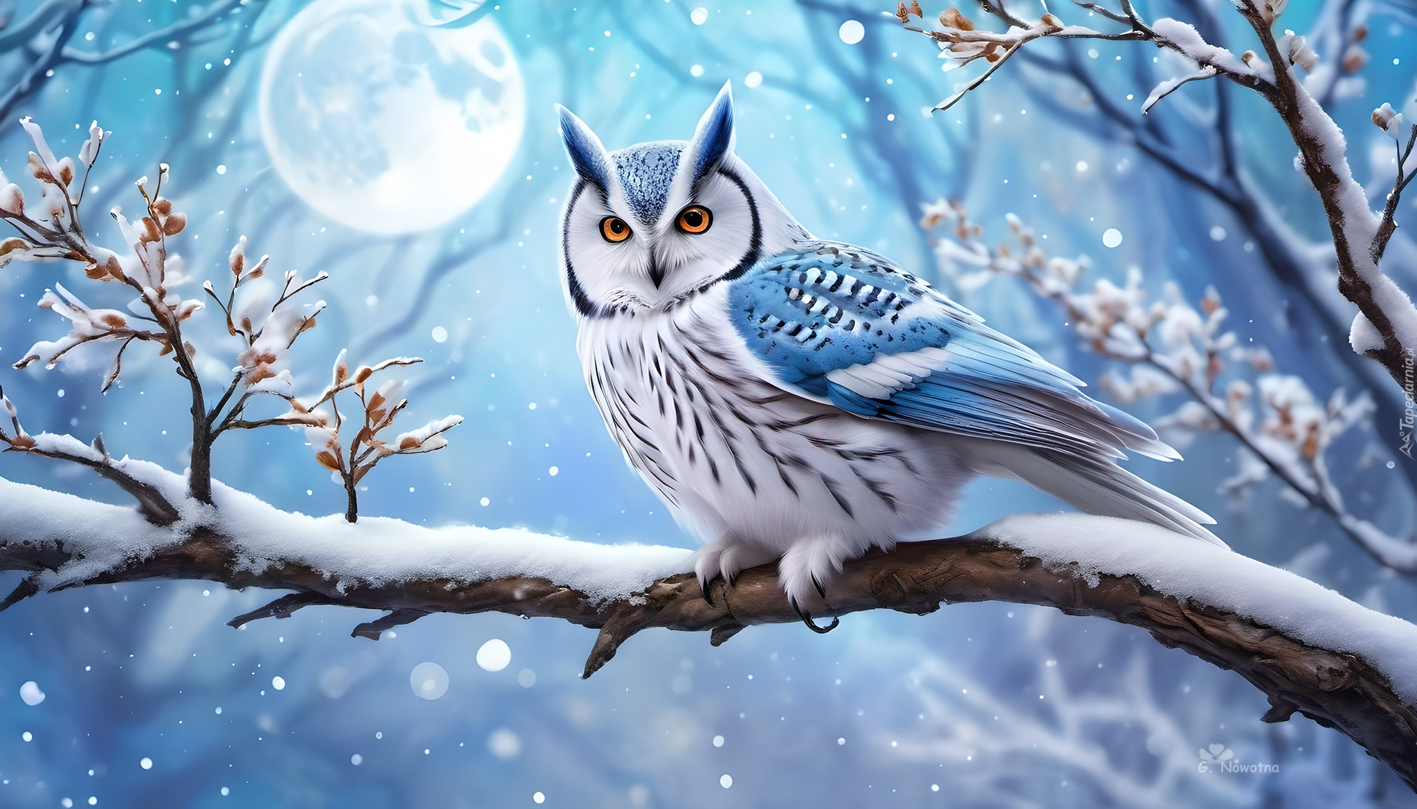 Edytor tapety: Sowa na ośnieżonej gałązce w blasku księżyca