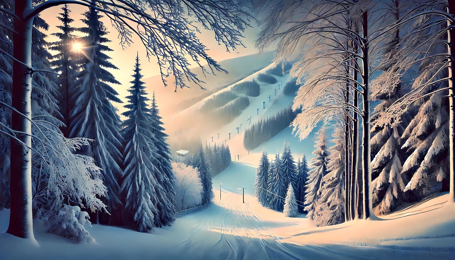 Edytor tapety: Ośnieżone drzewa na zaśnieżonych stokach w blasku słońca