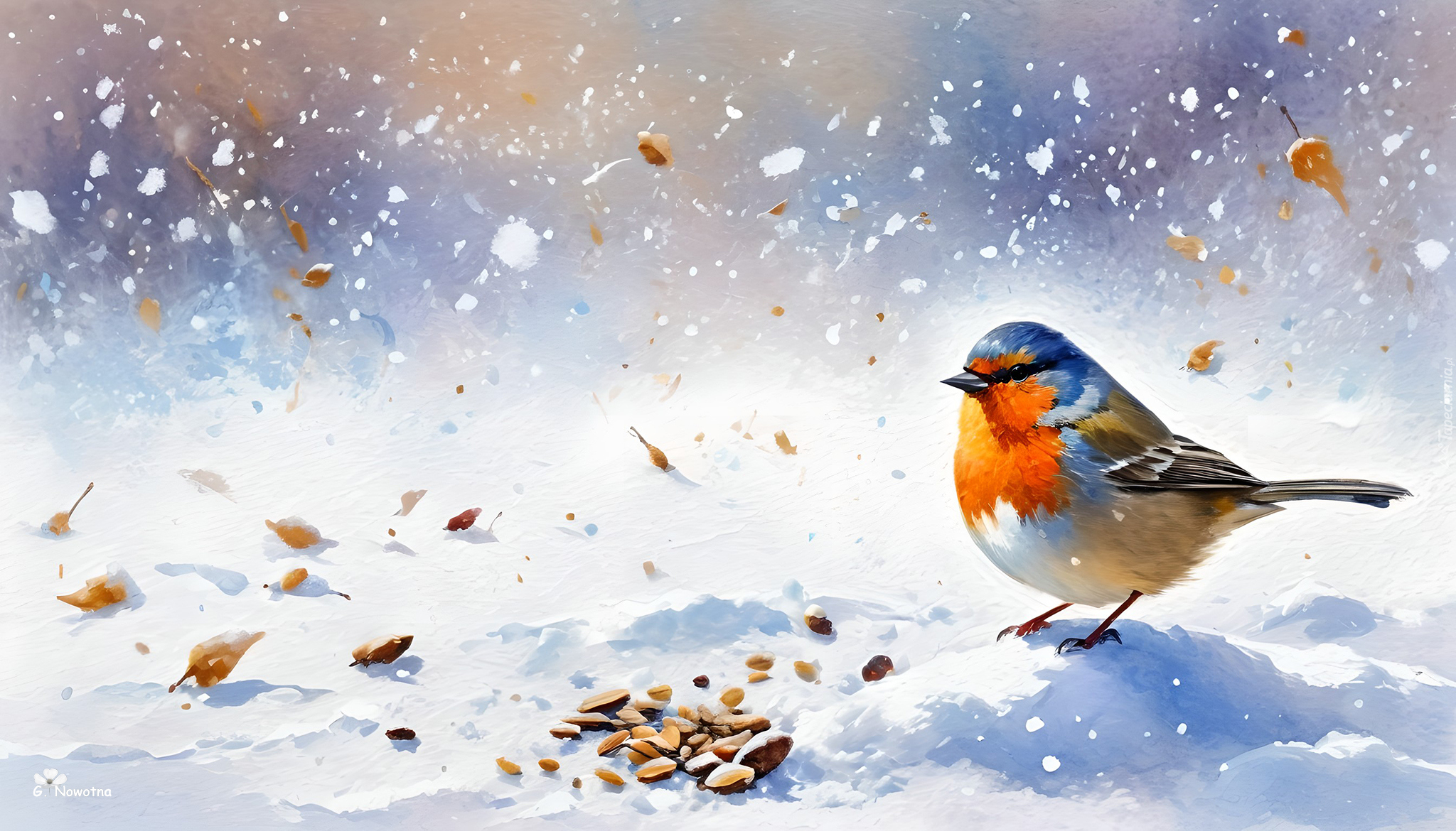 Edytor tapety: Kolorowy ptak i ziarna na śniegu