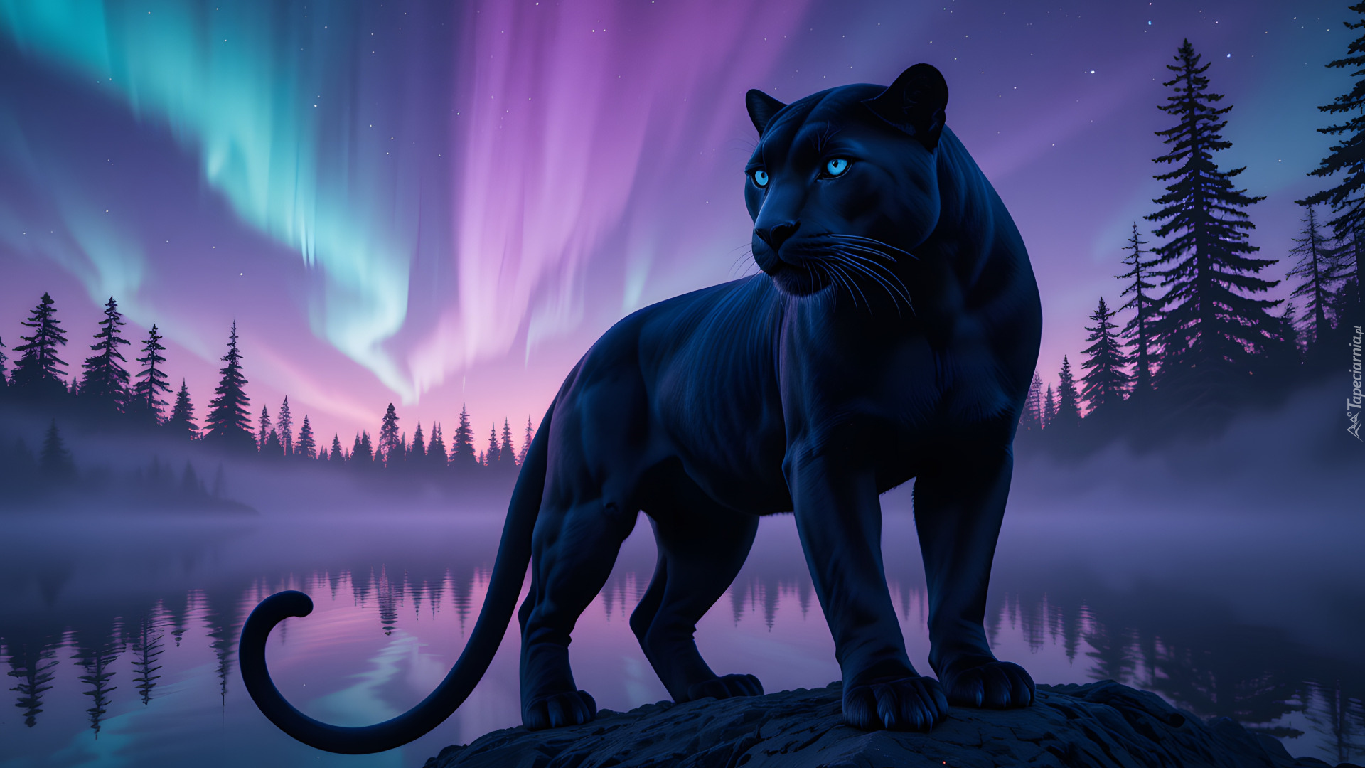 Edytor tapety: Czarny jaguar na tle zorzy polarnej