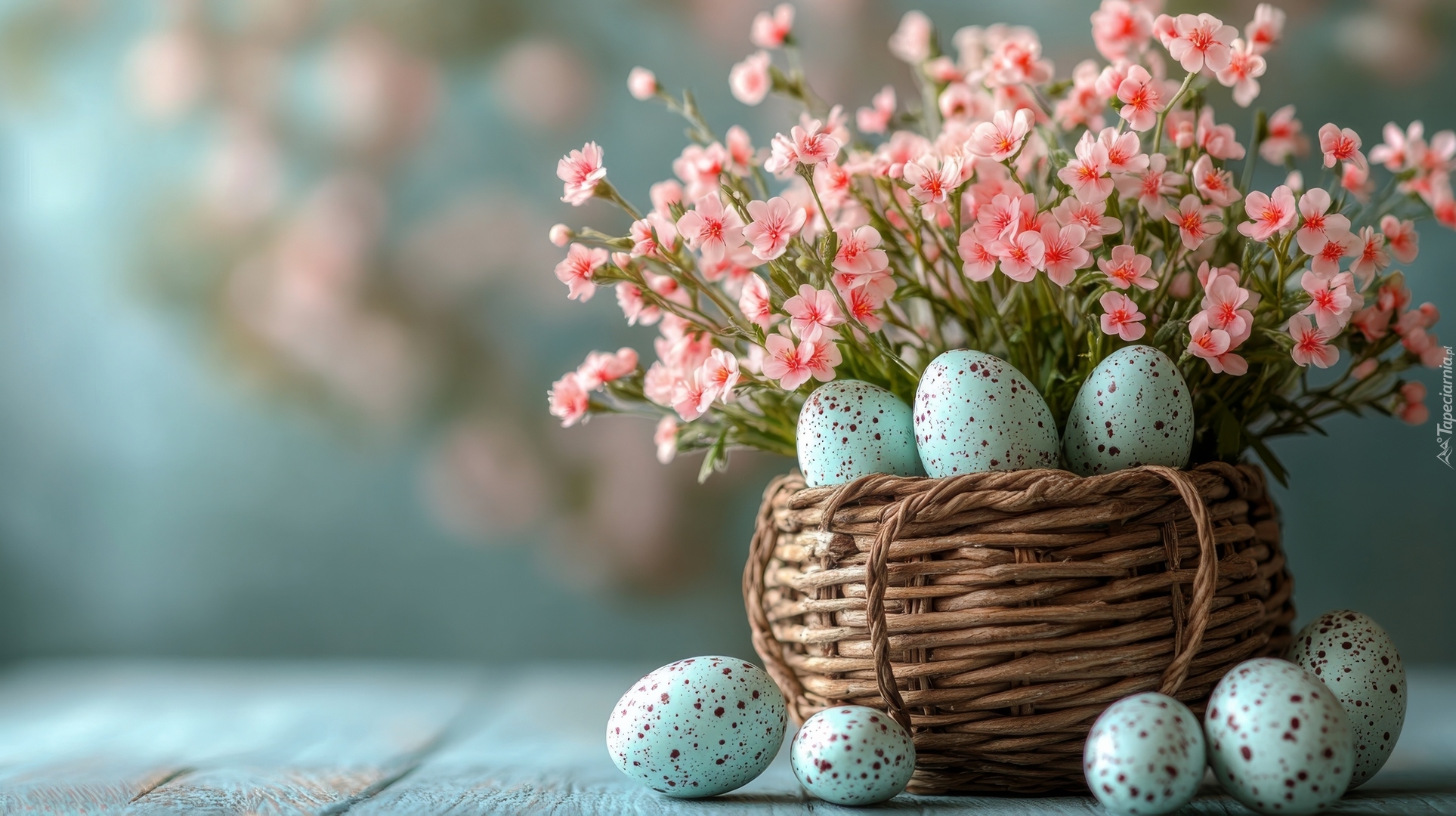 Edytor tapety: Kwiaty i pisanki w koszyku i obok