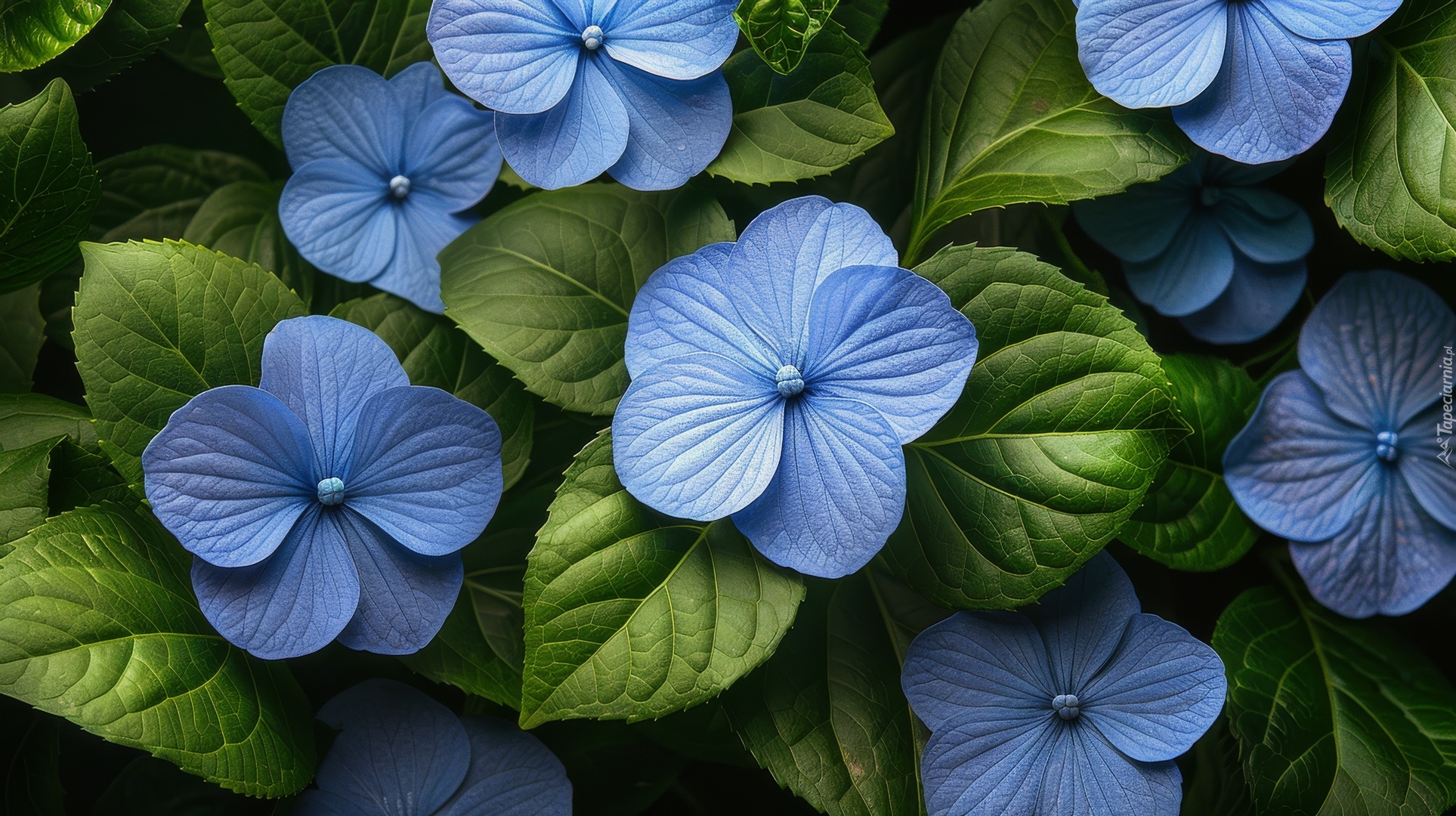 Edytor tapety: Niebieskie kwiaty hortensji i zielone liście