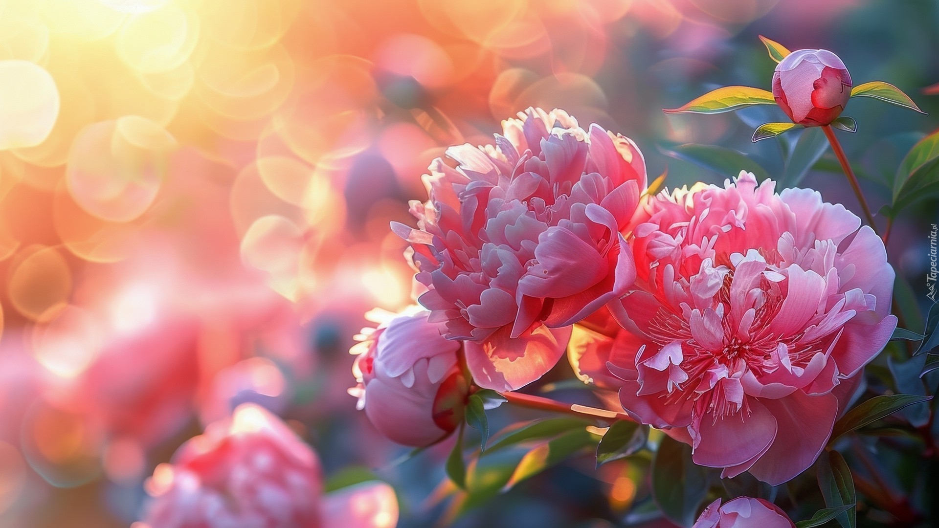 Edytor tapety: Różowe rozwinięte piwonie i pąki na słonecznym tle