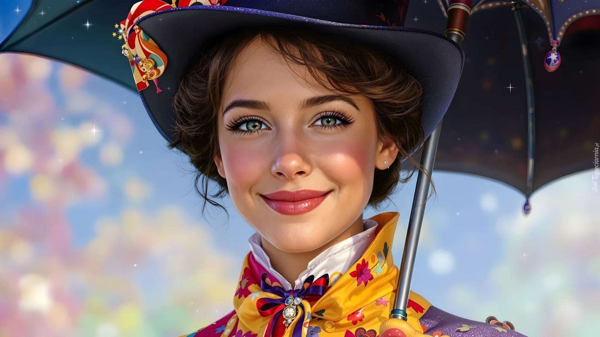 Edytor tapety: Uśmiechnięta kobieta w kapeluszu pod parasolem