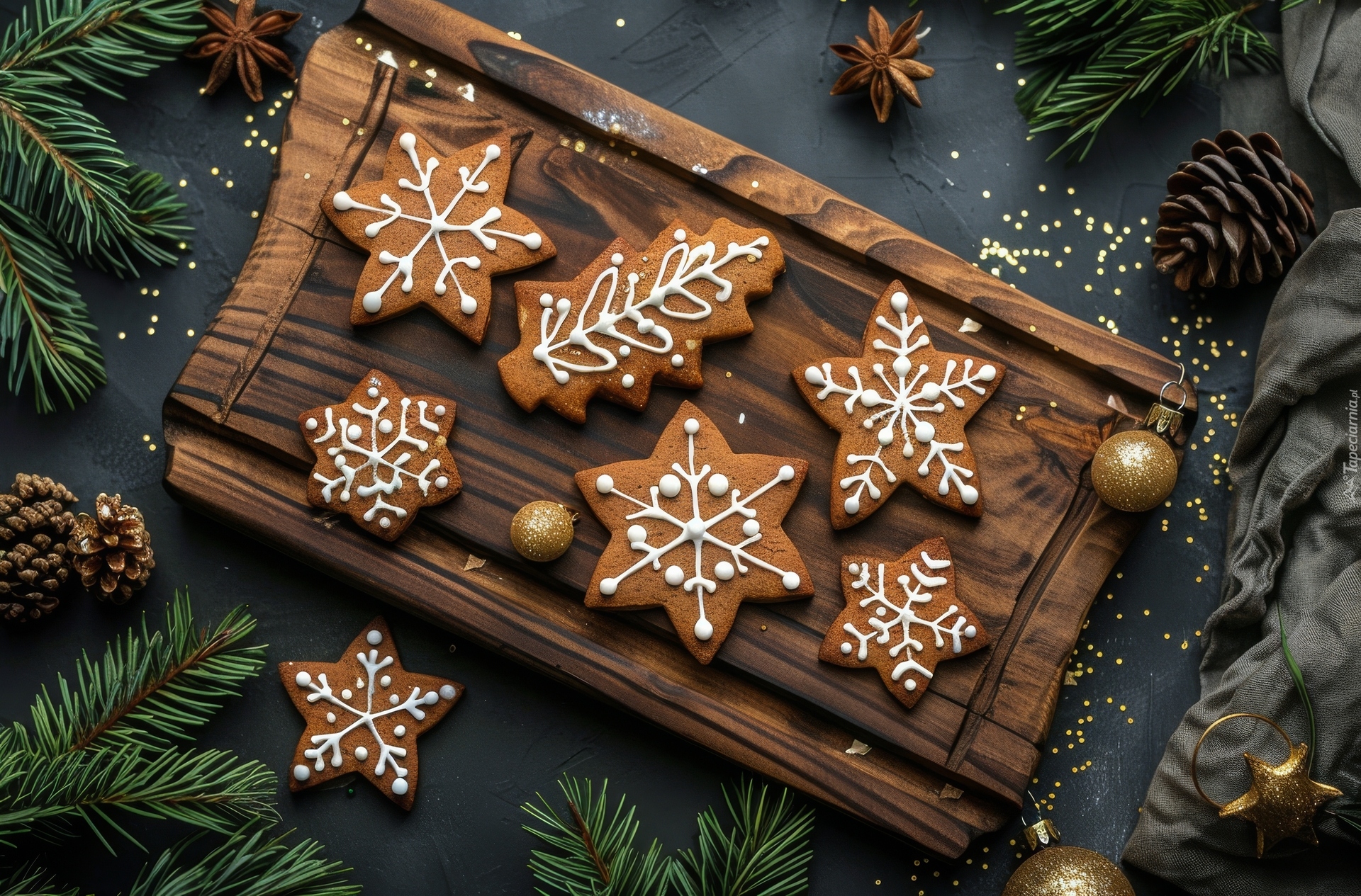 Edytor tapety: Świąteczne lukrowane pierniki na desce otoczone gałązkami