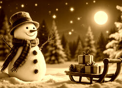 Edytor tapety: Bałwanek w kapeluszu i szaliku obok sanek z prezentami