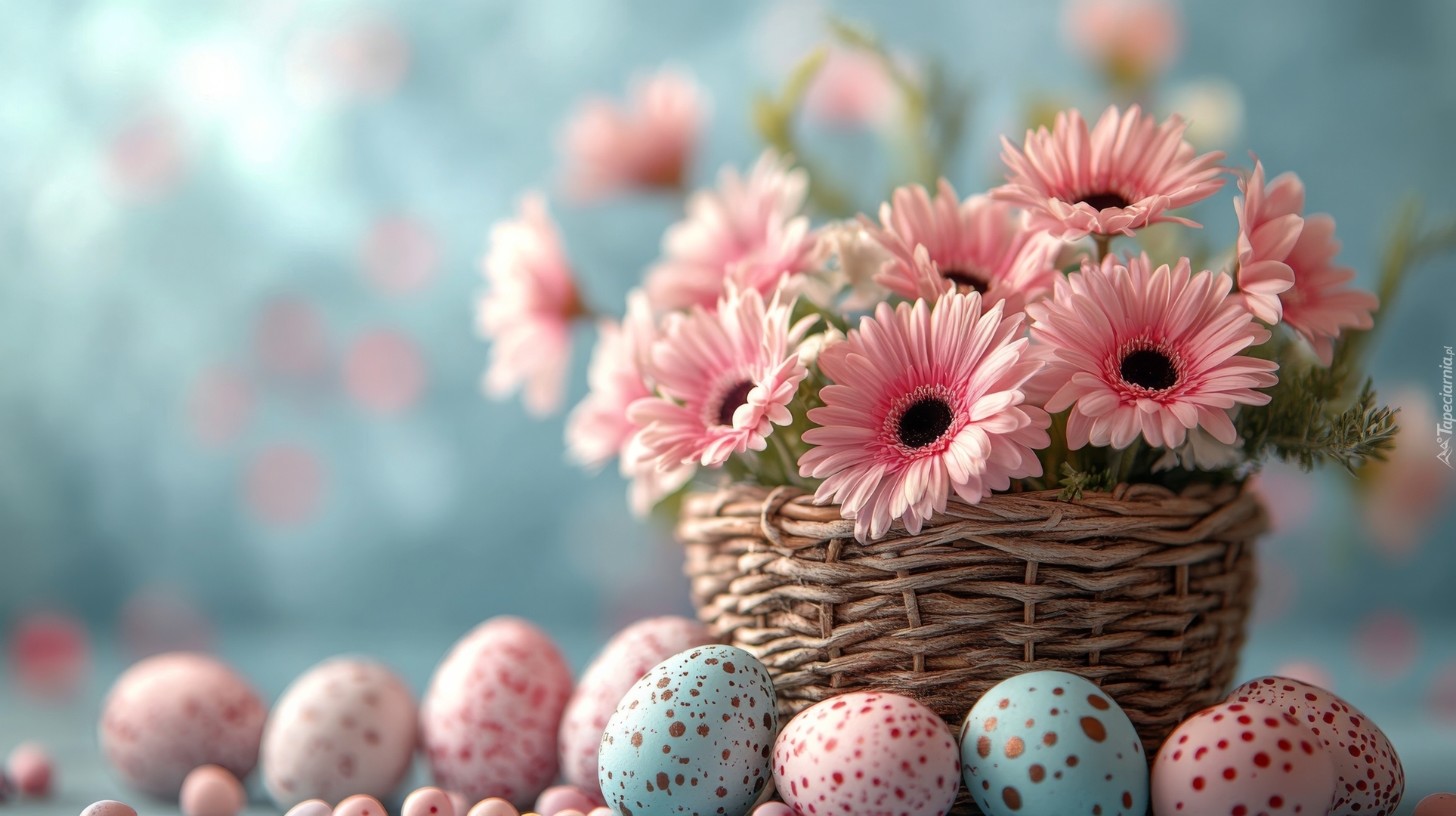Edytor tapety: Pisanki obok koszyka z gerberami
