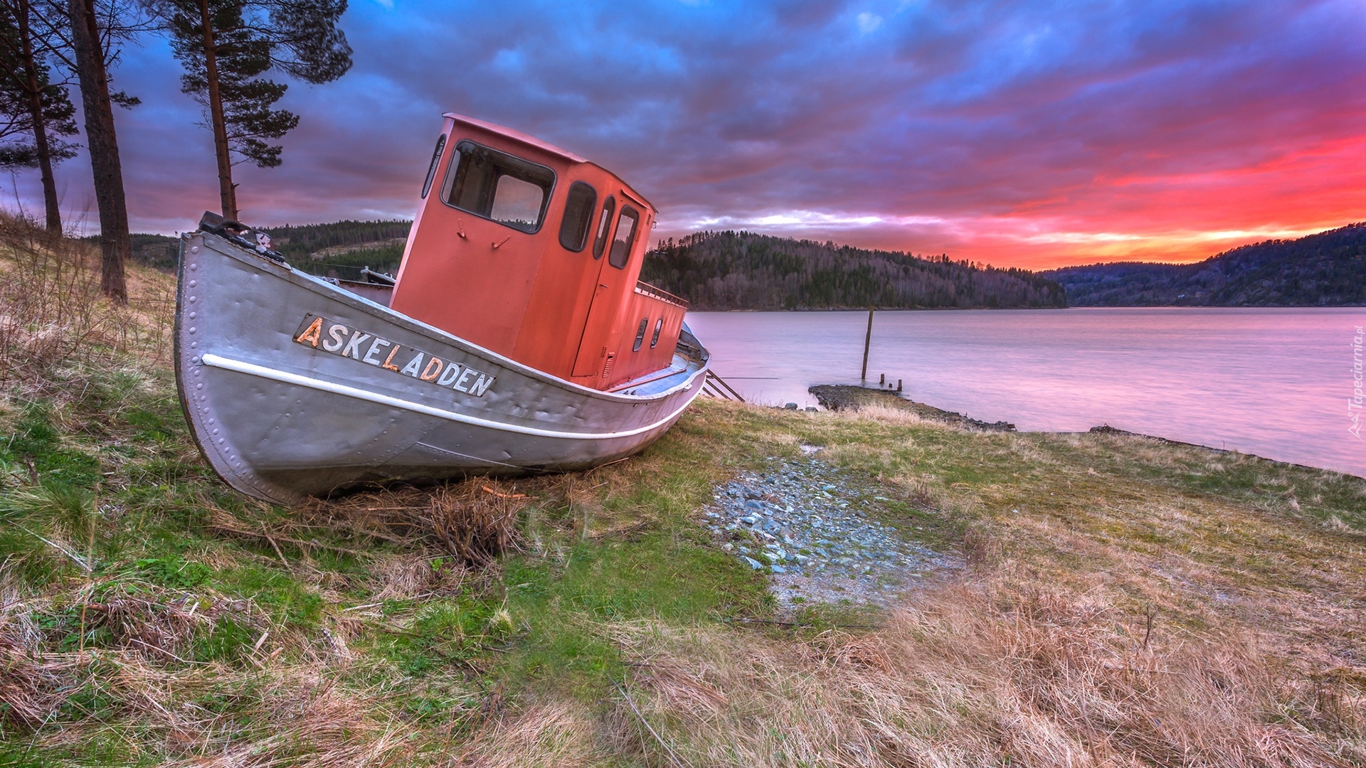 Edytor tapety: Łódka i drzewa na brzegu jeziora pod chmurami