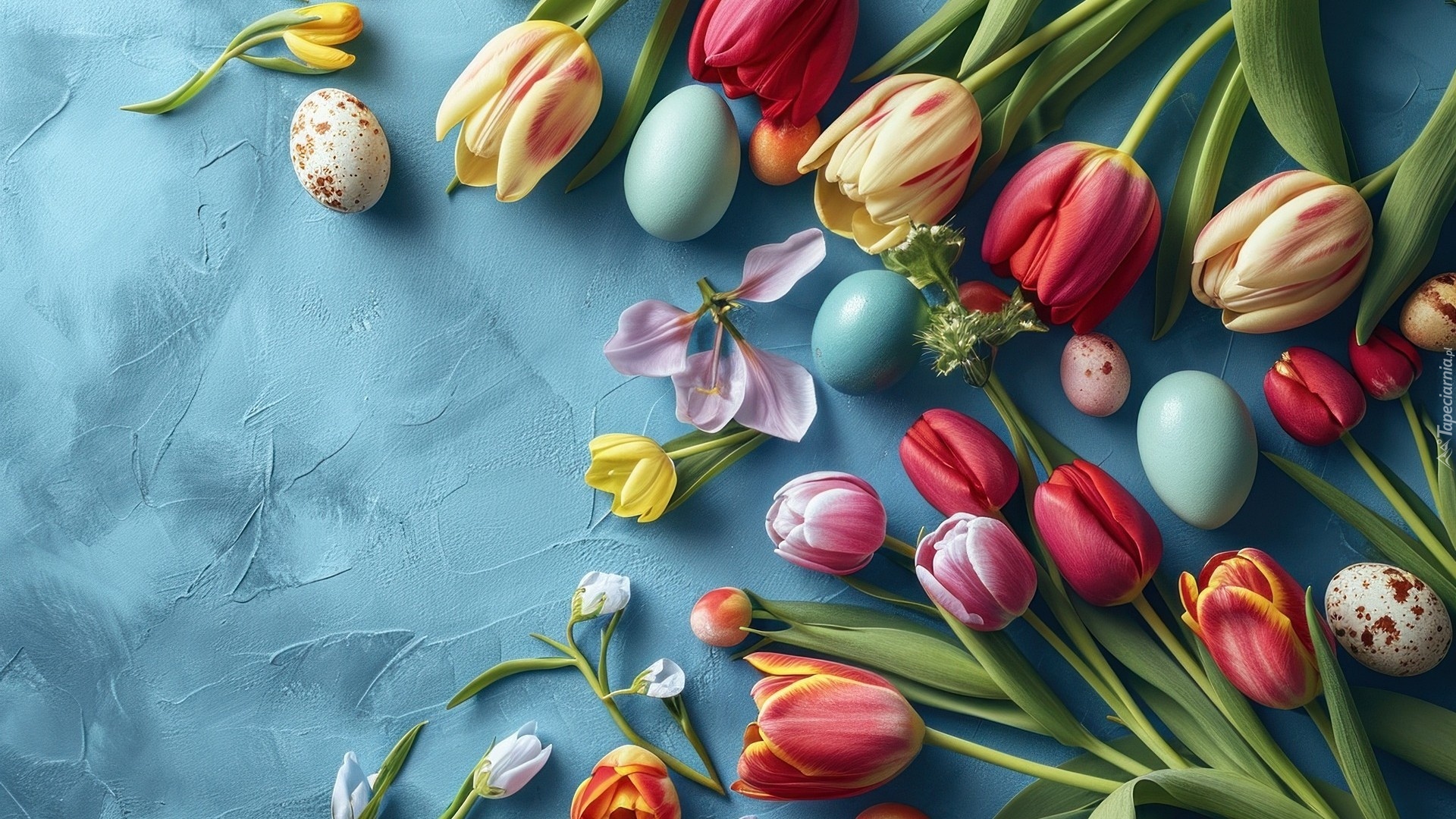 Edytor tapety: Kolorowe tulipany i pisanki na niebieskim tle