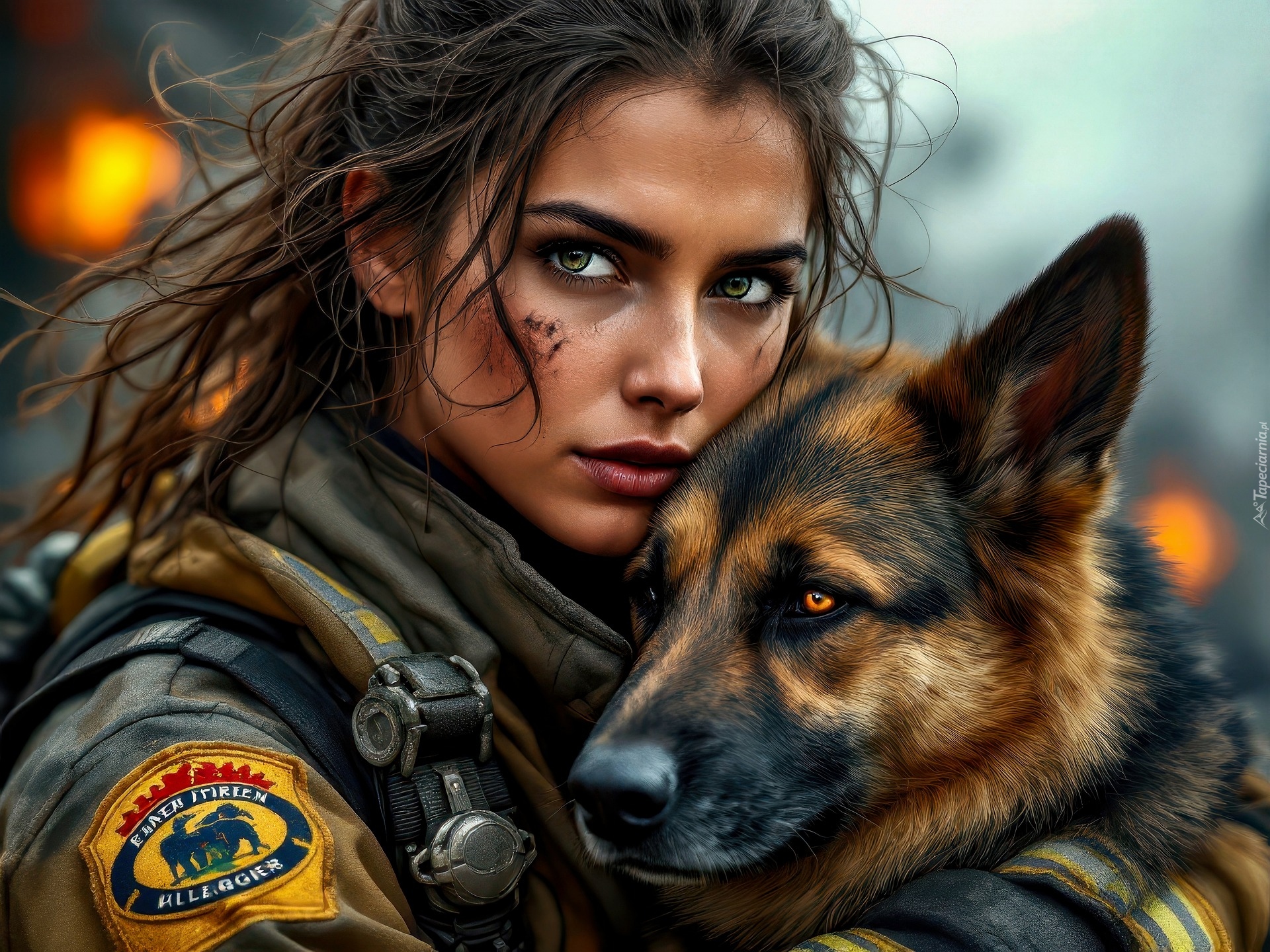 Edytor tapety: Kobieta strażaczka z owczarkiem niemieckim