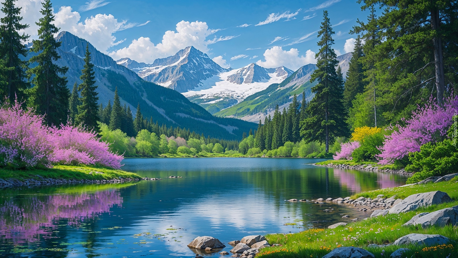 Edytor tapety: Drzewa i kwitnące krzewy nad górskim jeziorem