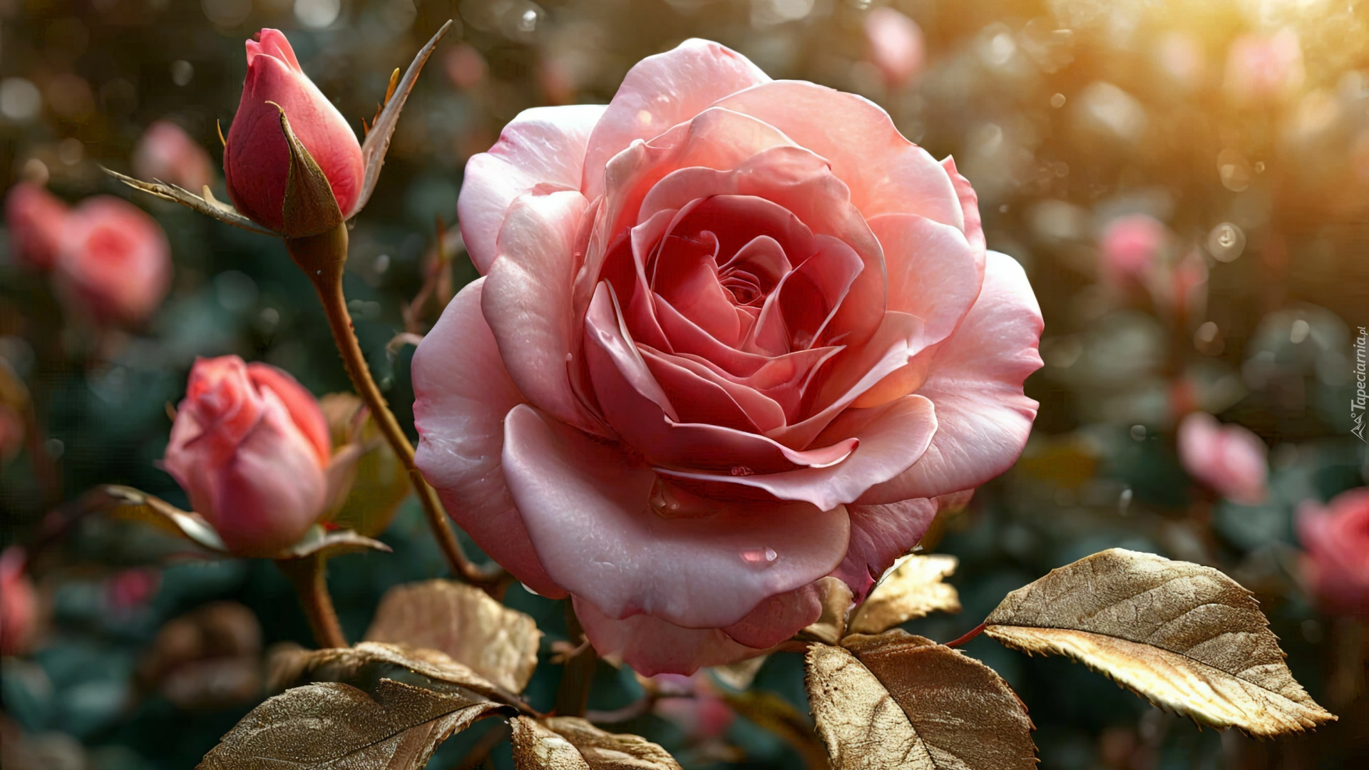 Edytor tapety: Rozkwitnięta różowa róża z pąkami obok
