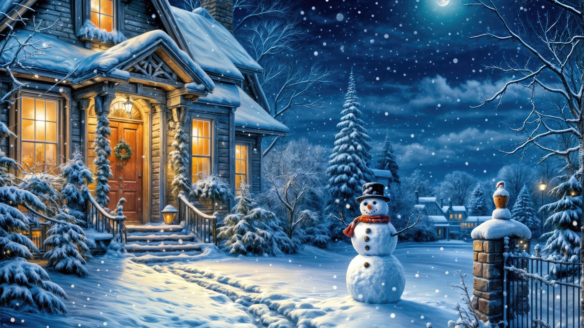 Edytor tapety: Bałwanek przed udekorowanym i oświetlonym nocą domem