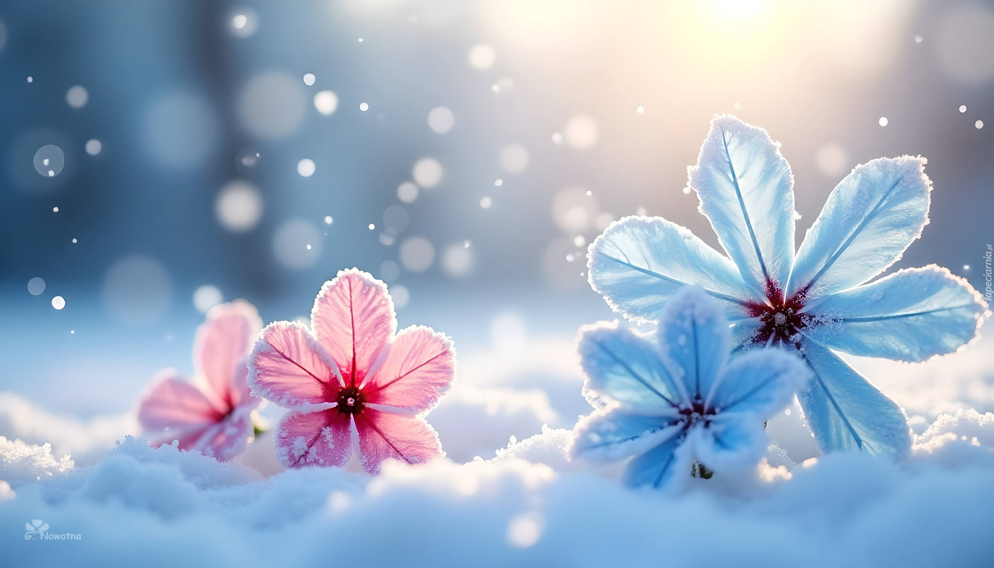 Edytor tapety: Różowe i niebieskie kwiaty w śniegu