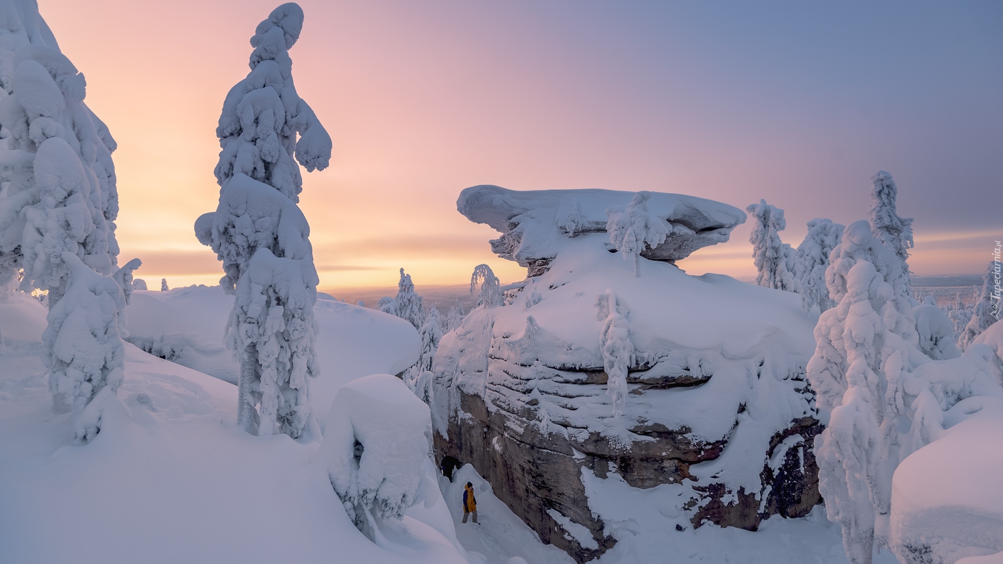 Edytor tapety: Zasypane śniegiem drzewa i skały