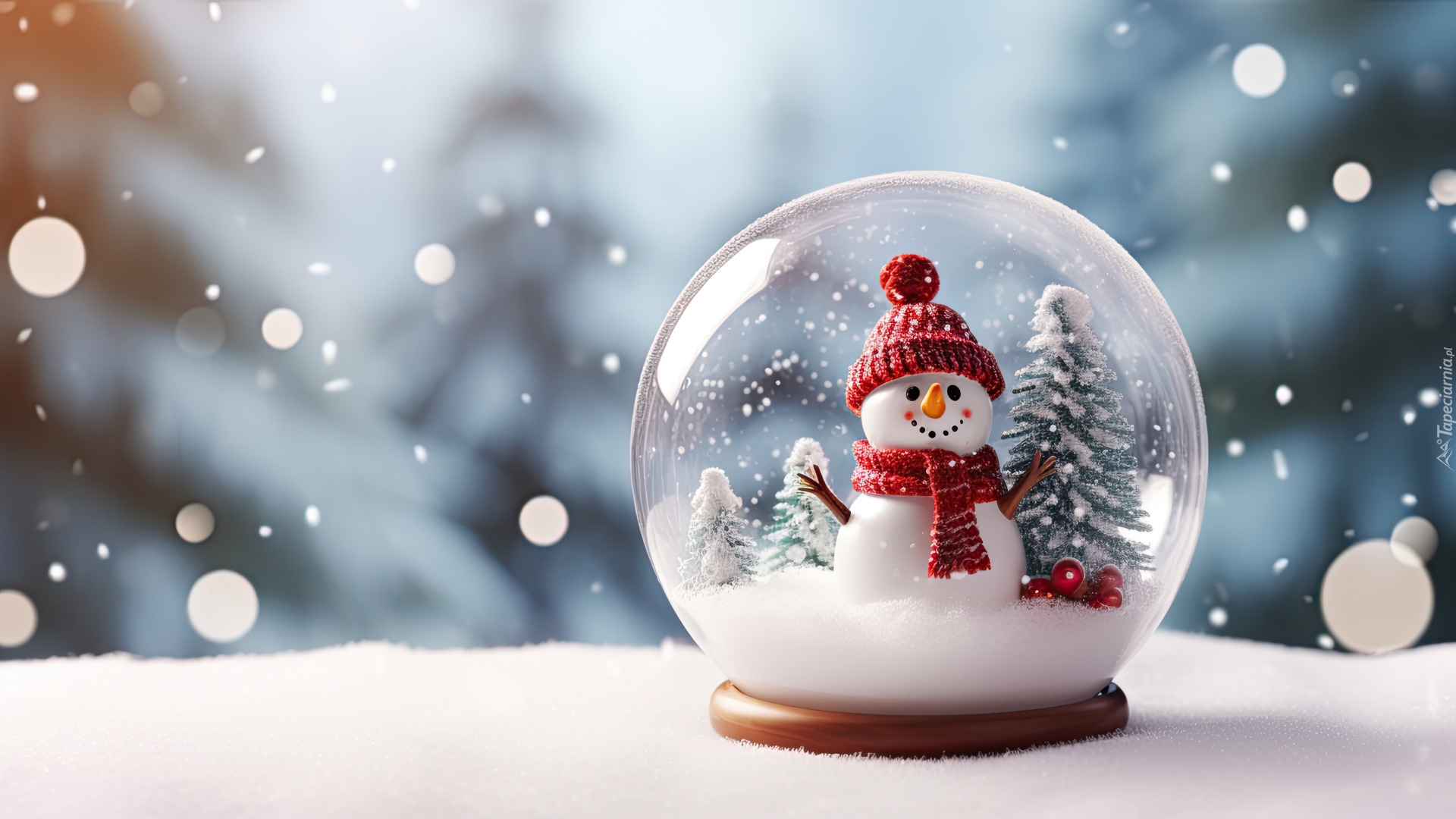 Edytor tapety: Szklana kula z bałwankiem i choinką na śniegu