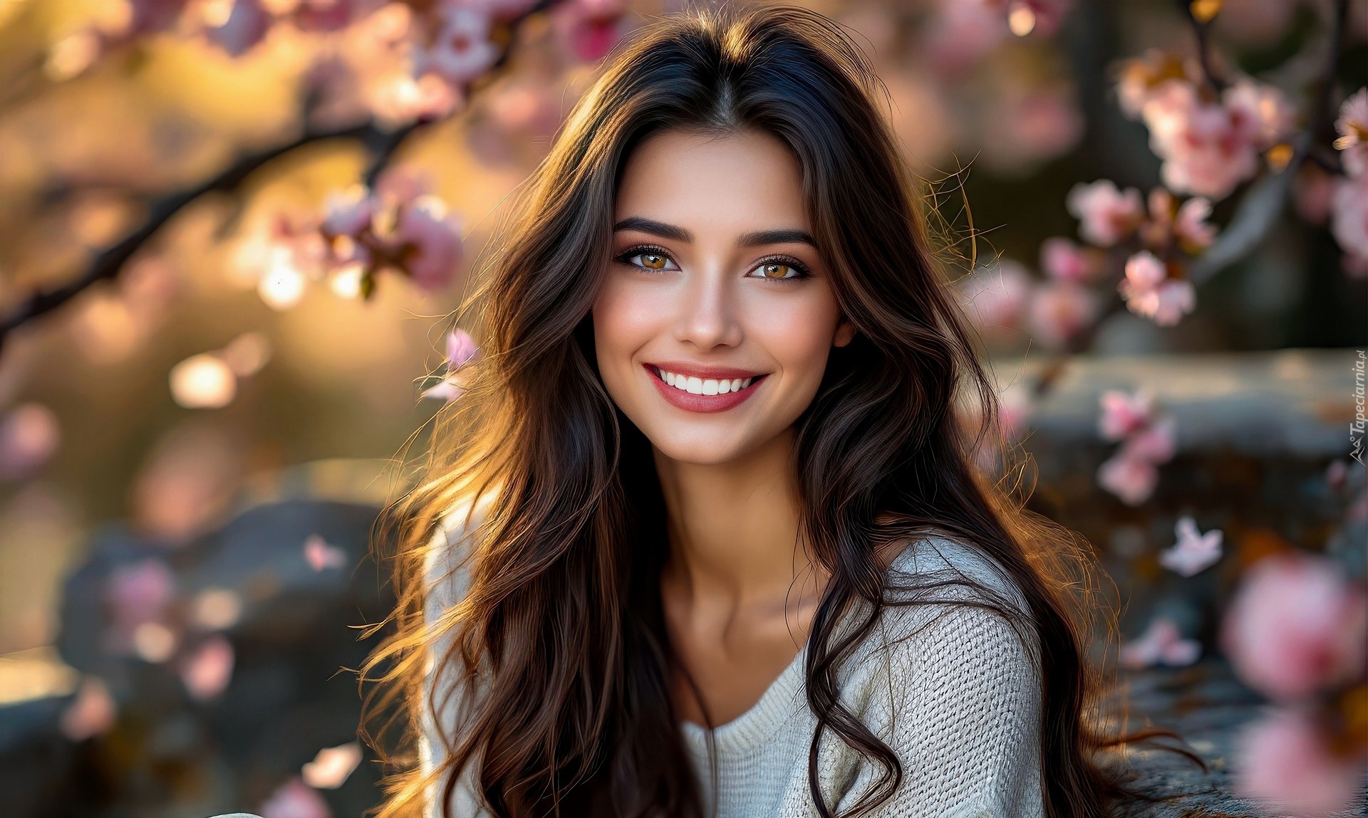 Edytor tapety: Uśmiechnięta długowłosa kobieta na tle ukwieconych gałązek