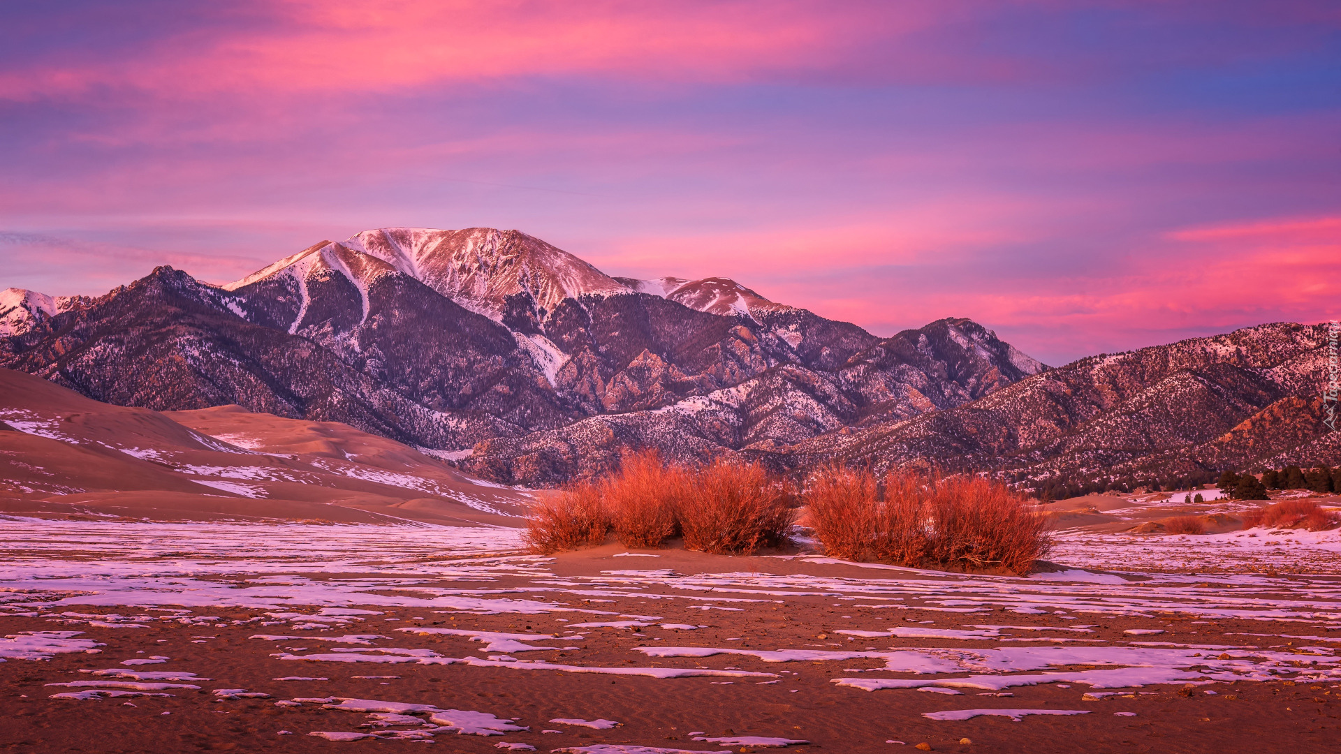 Edytor tapety: Krzewy na piasku i góry pod kolorowym niebem