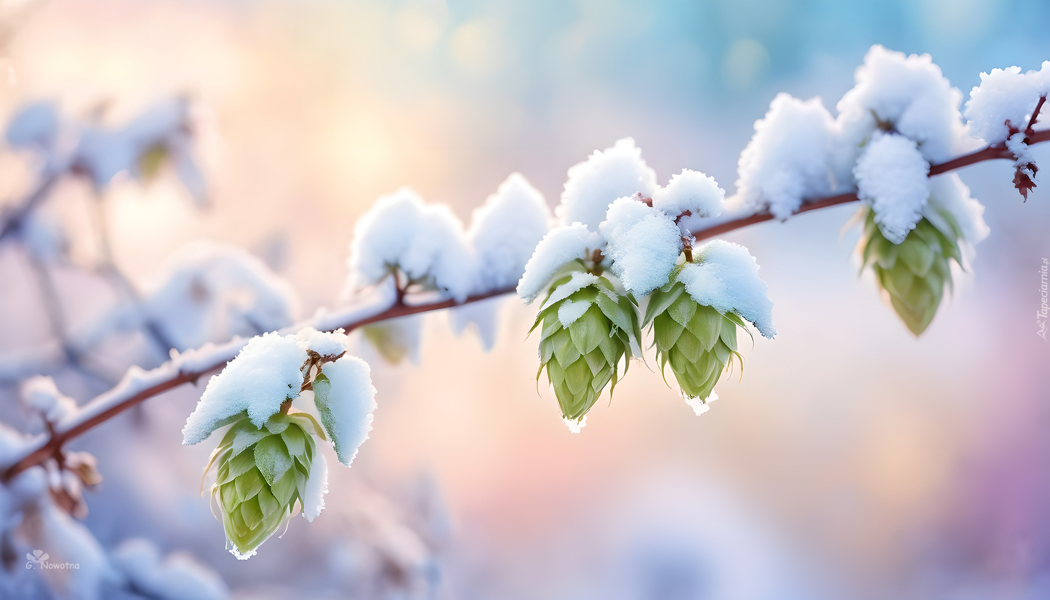 Edytor tapety: Szyszki chmielu na ośnieżonej gałązce