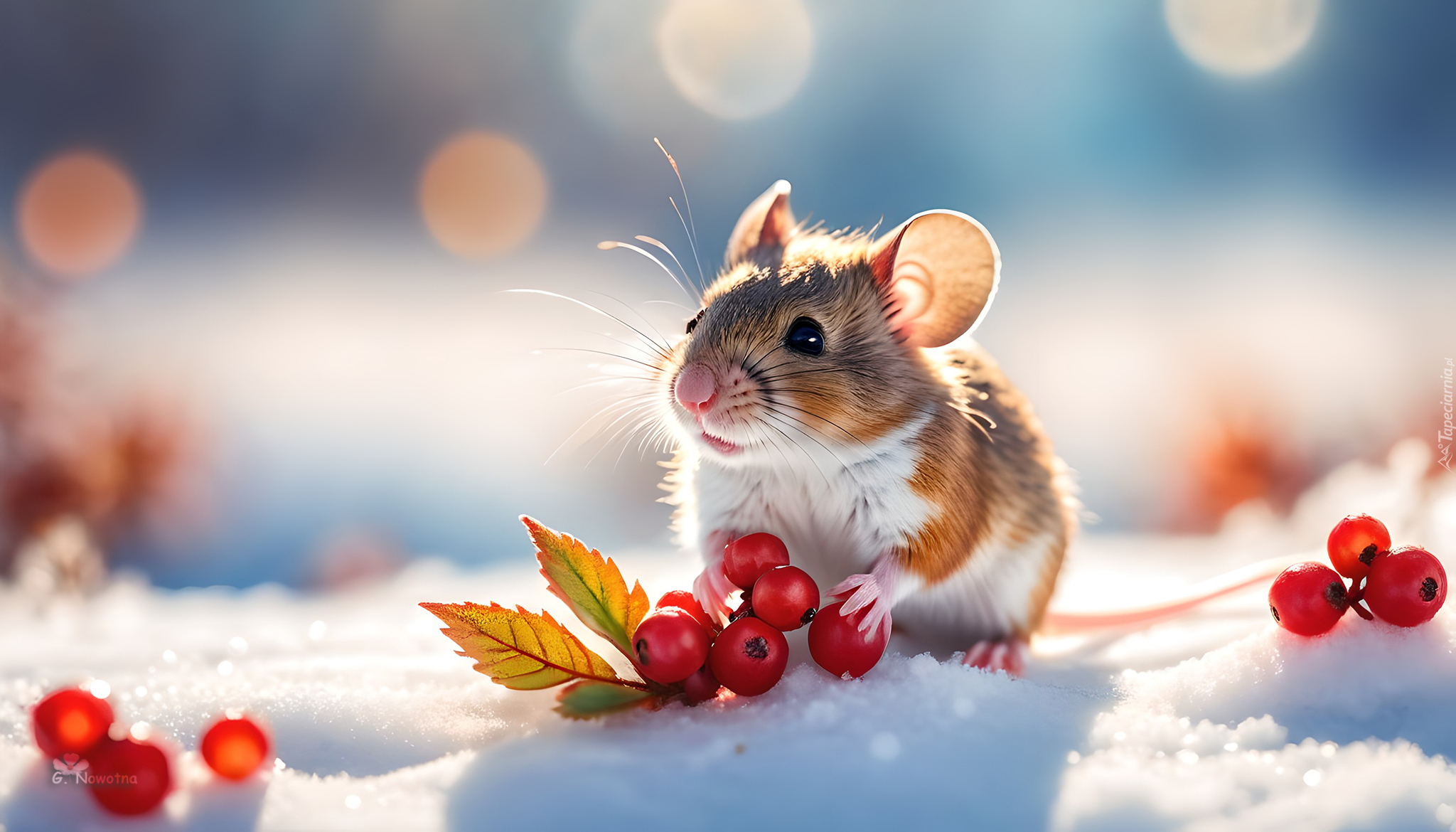 Edytor tapety: Mysz i owoce jarzębiny na śniegu