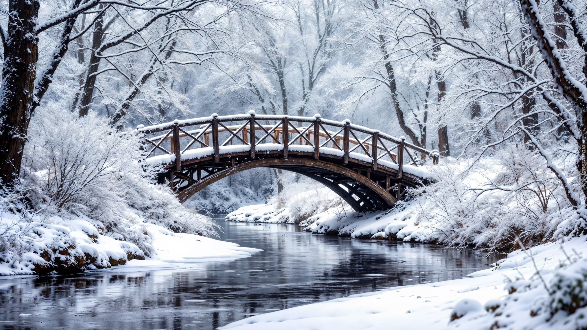Edytor tapety: Ośnieżone drzewa i most nad rzeką zimową porą