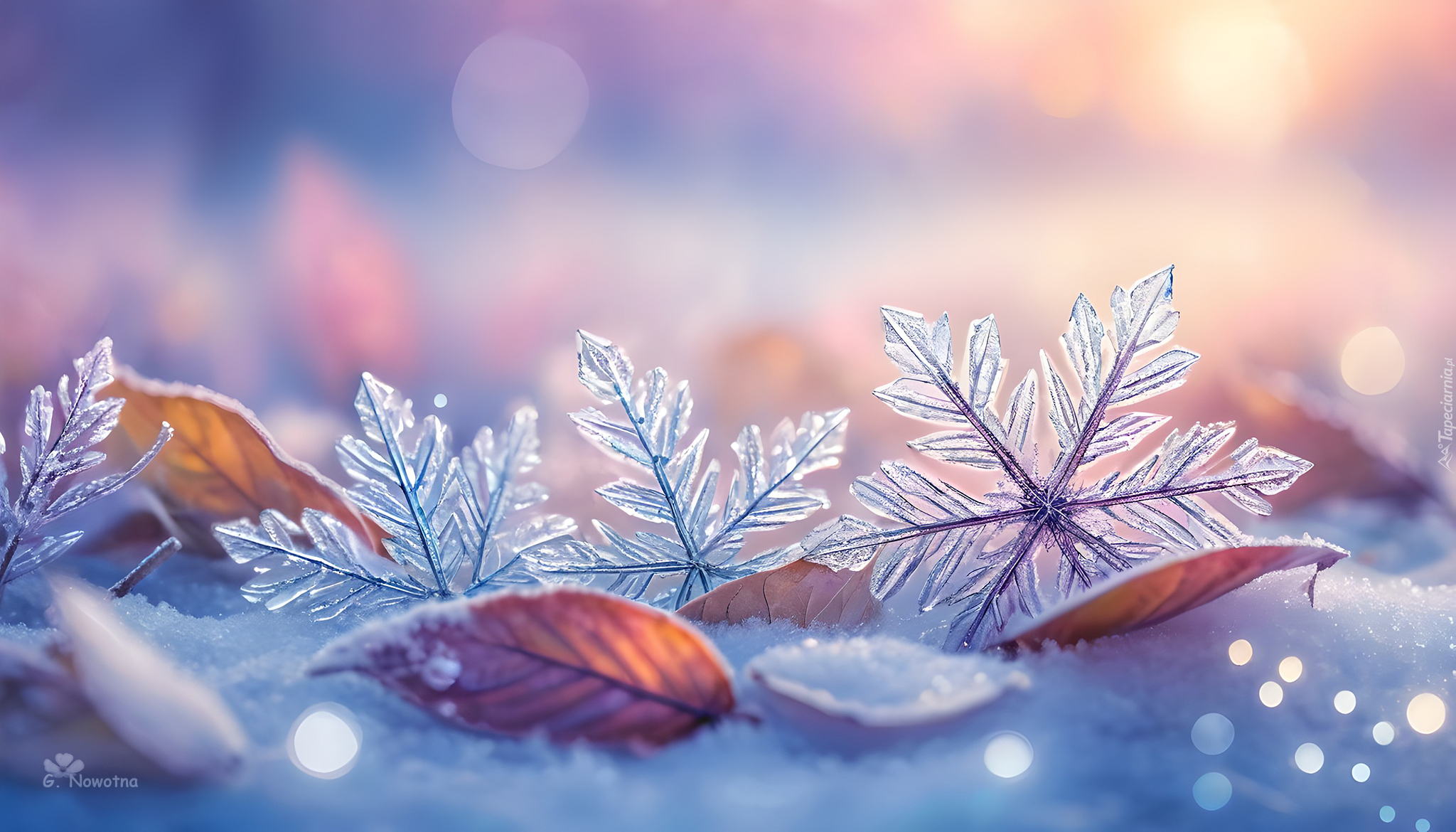 Edytor tapety: Śnieżynki i oszronione jesienne liście na śniegu