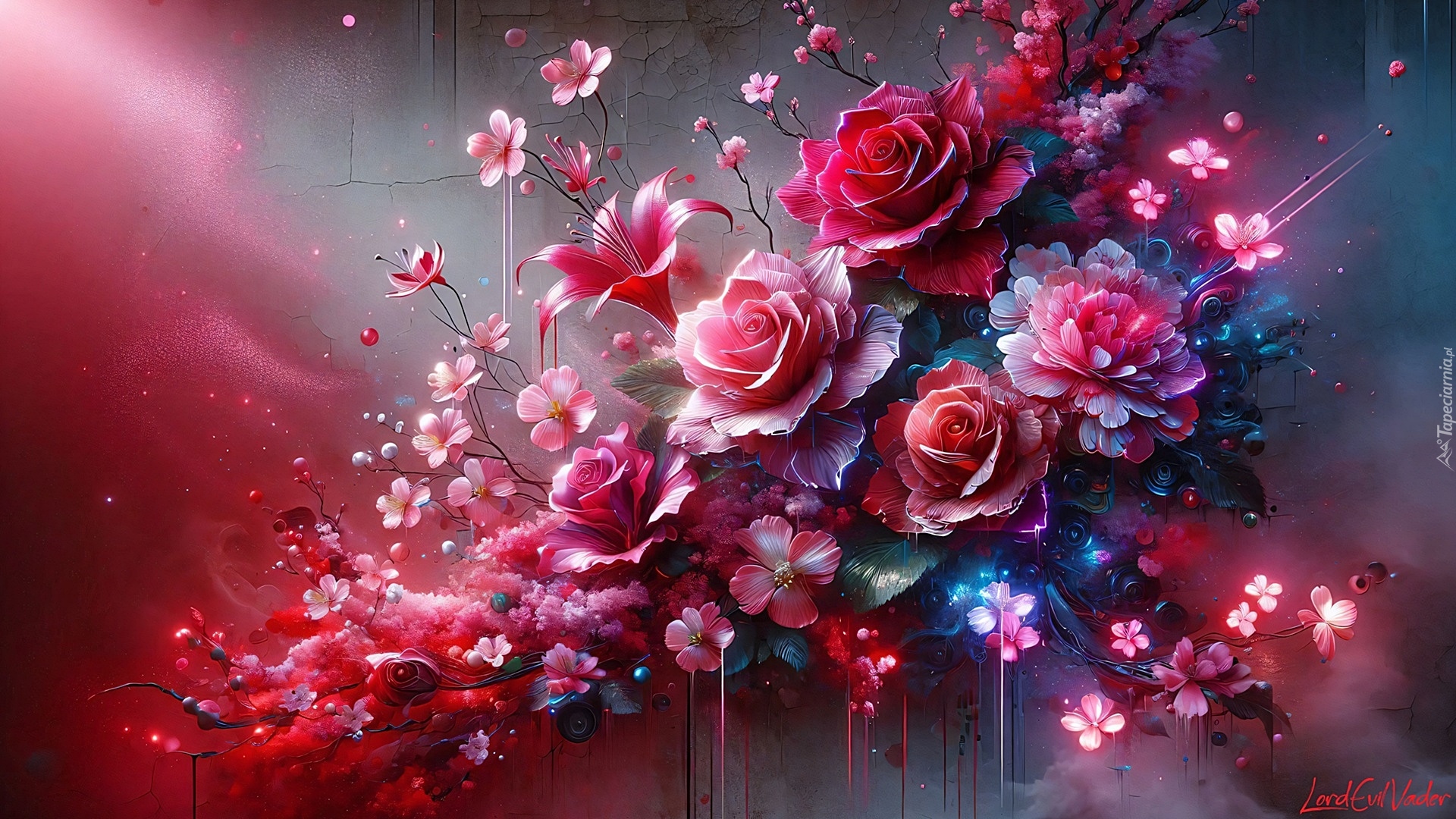 Edytor tapety: Czerwone róże i inne drobne kwiaty w grafice