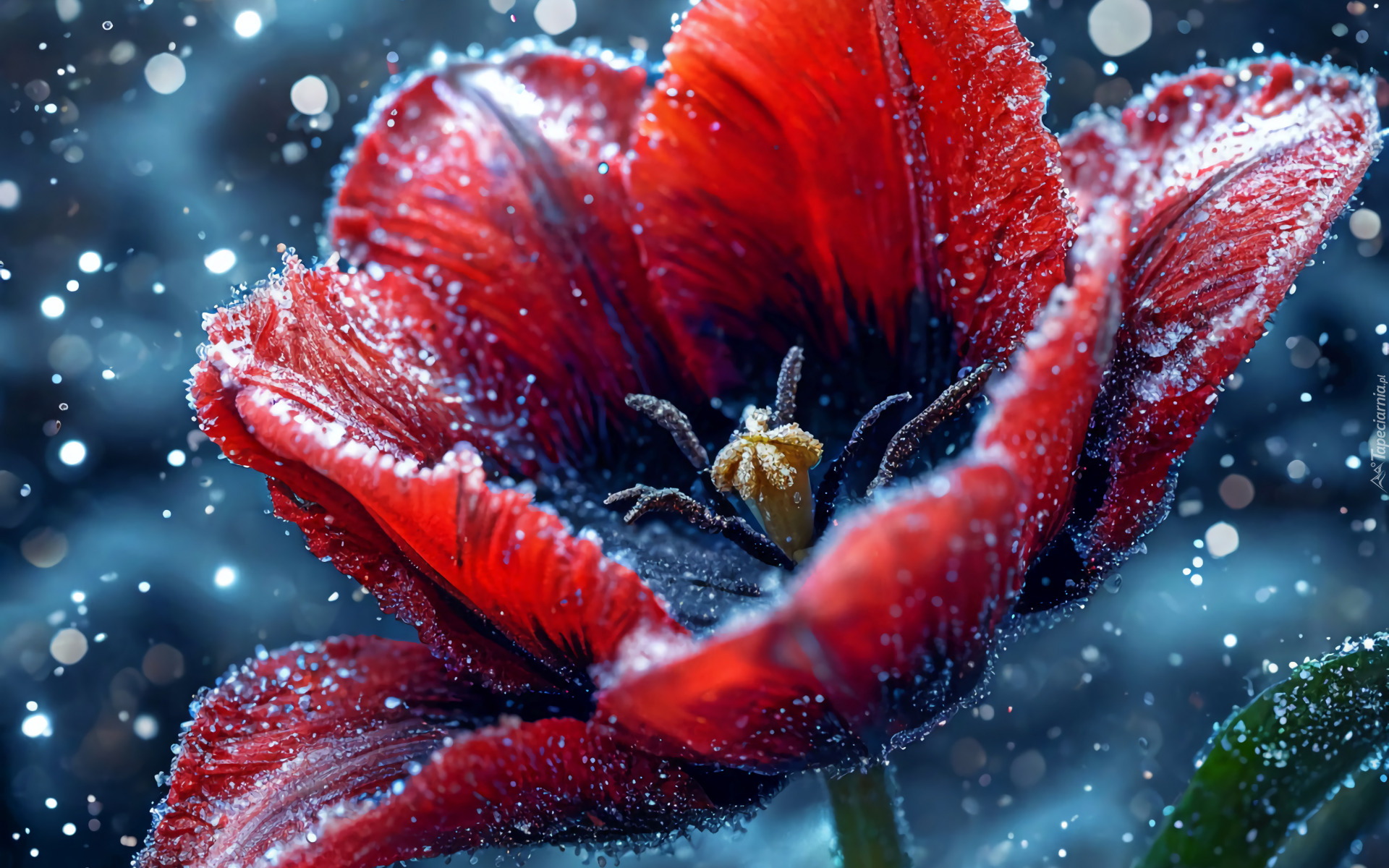 Edytor tapety: Oszroniony i rozkwitnięty czerwony tulipan