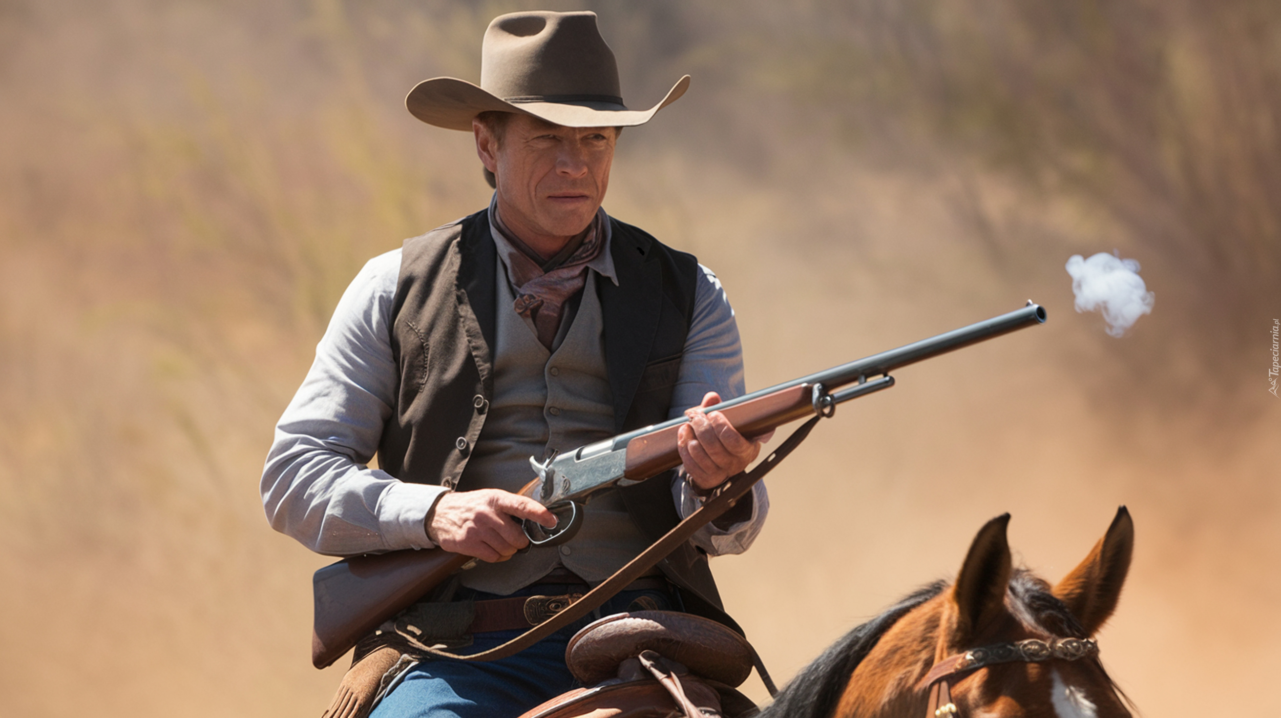 Edytor tapety: Kowboj ze strzelbą na koniu