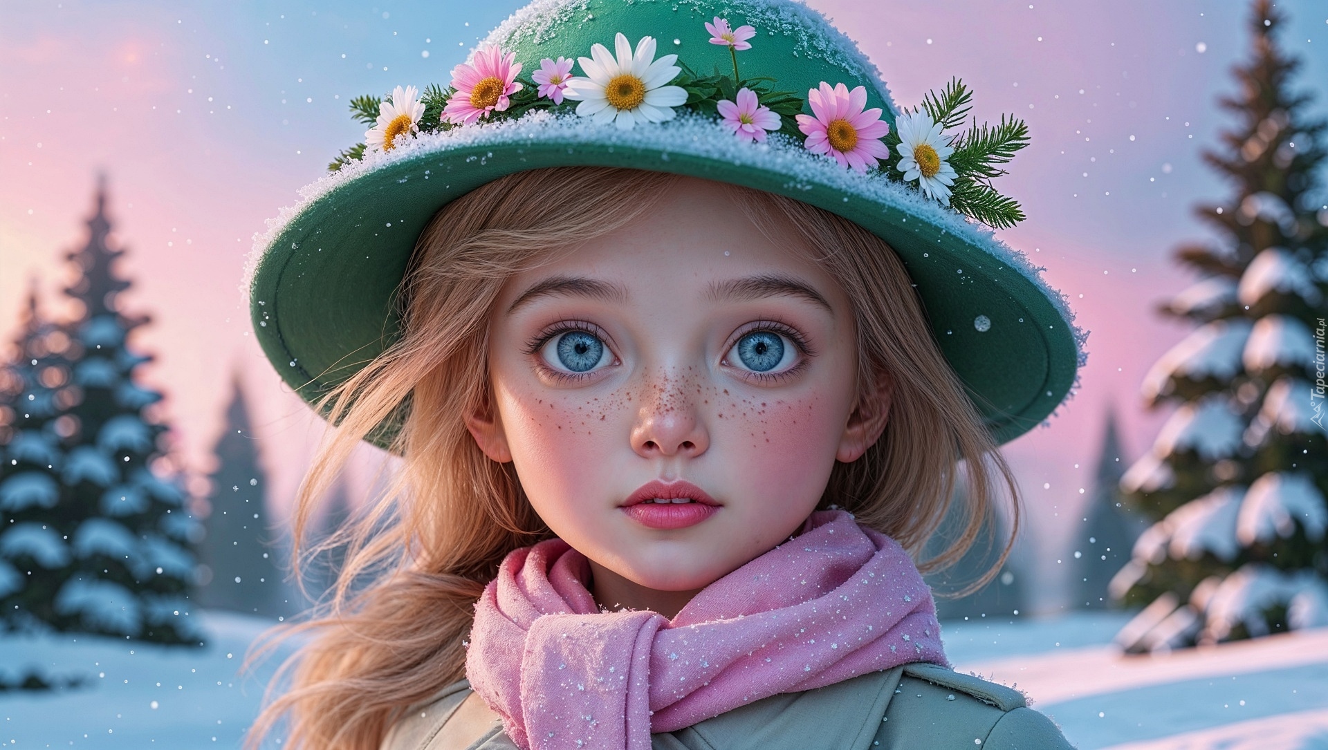 Edytor tapety: Piegowata dziewczynka z kwiatami na zielonym kapeluszu