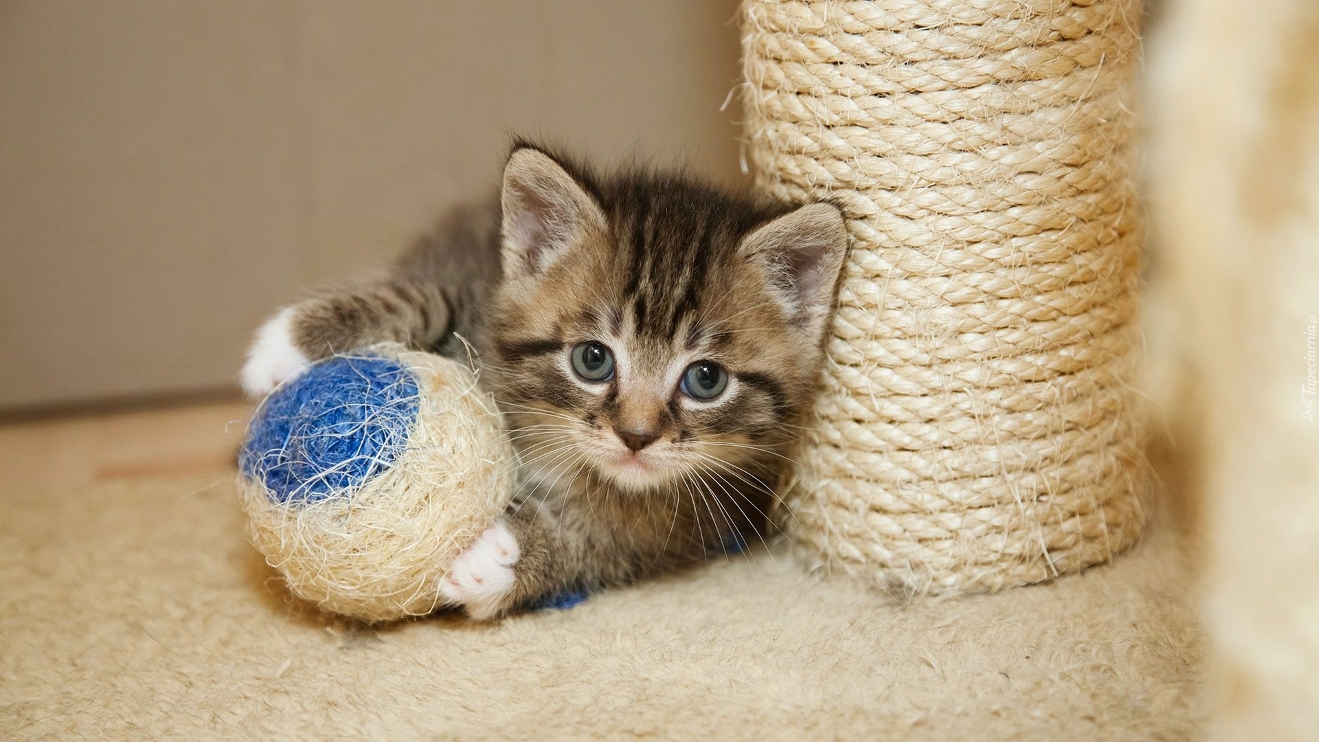 Edytor tapety: Mały kotek z piłką obok drapaka