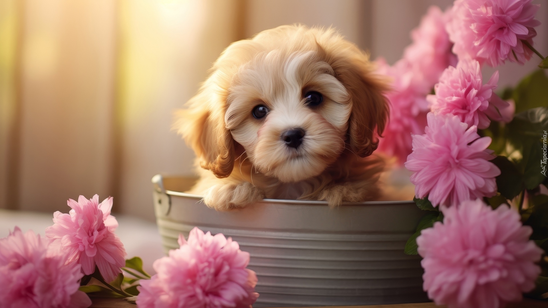 Edytor tapety: Mordka szczeniaka obok różowych kwiatów