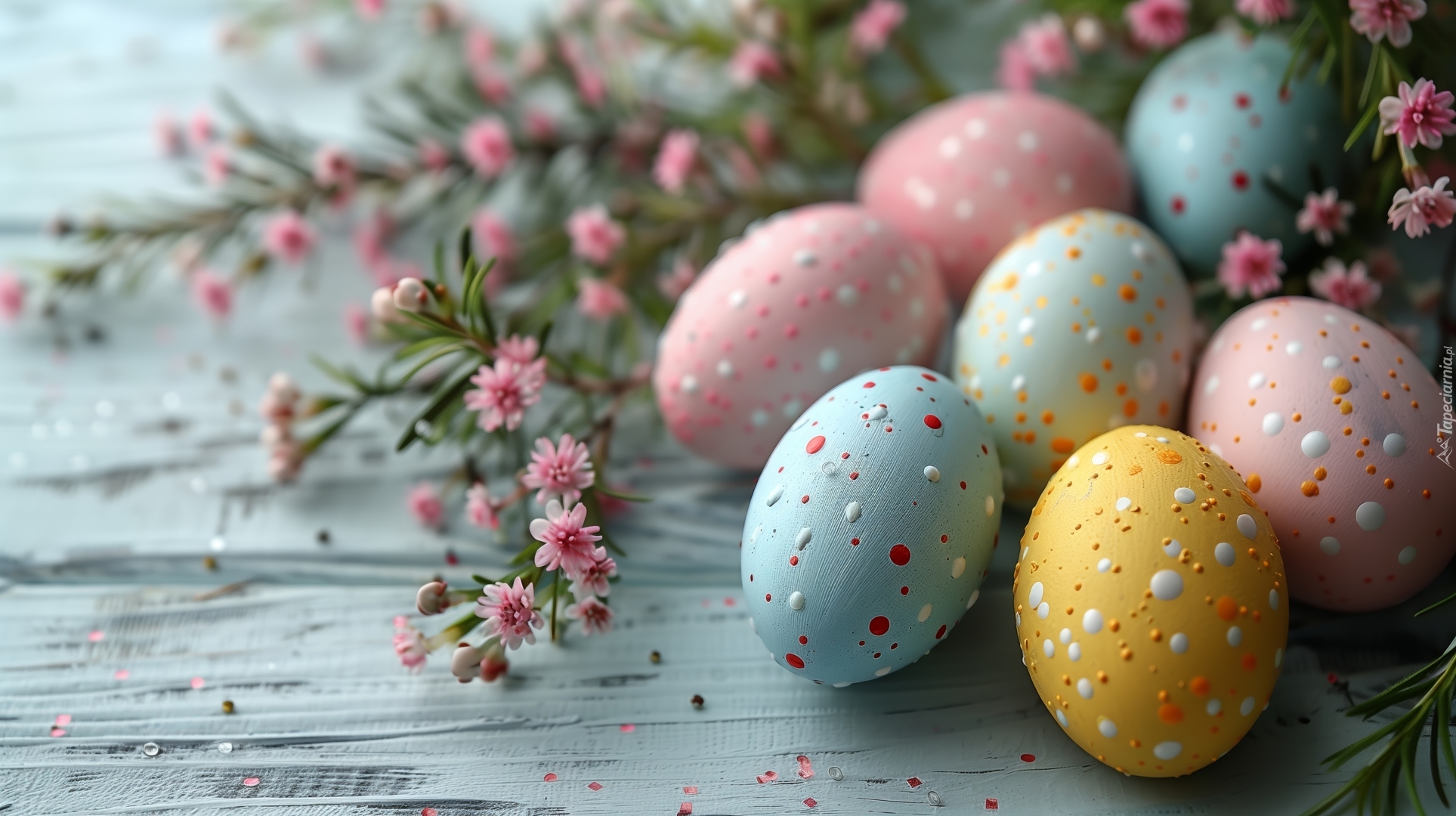 Edytor tapety: Nakrapiane kolorowe pisanki i ukwiecone gałązki na deskach