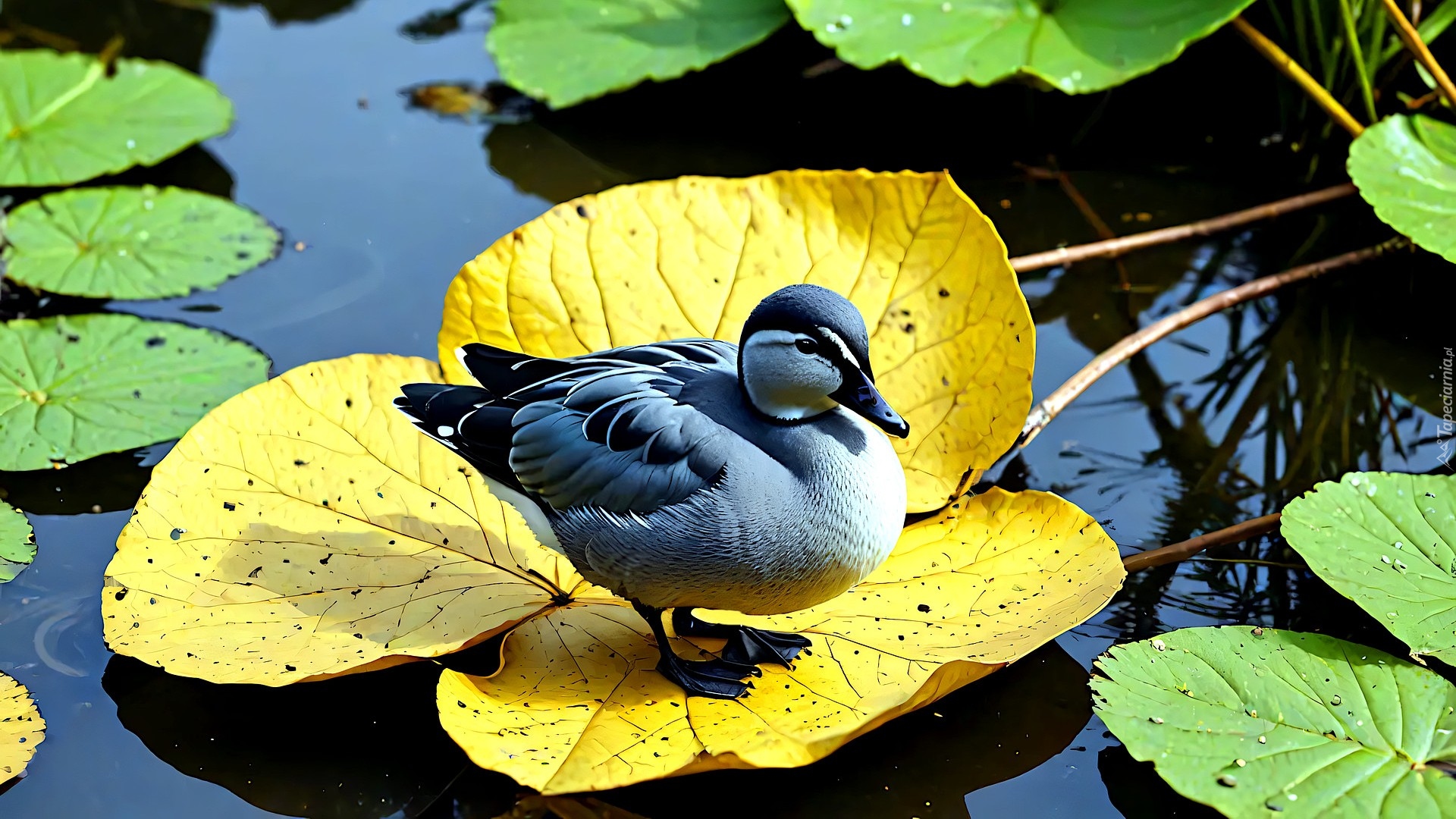 Edytor tapety: Kaczka na żółtym liściu na wodzie