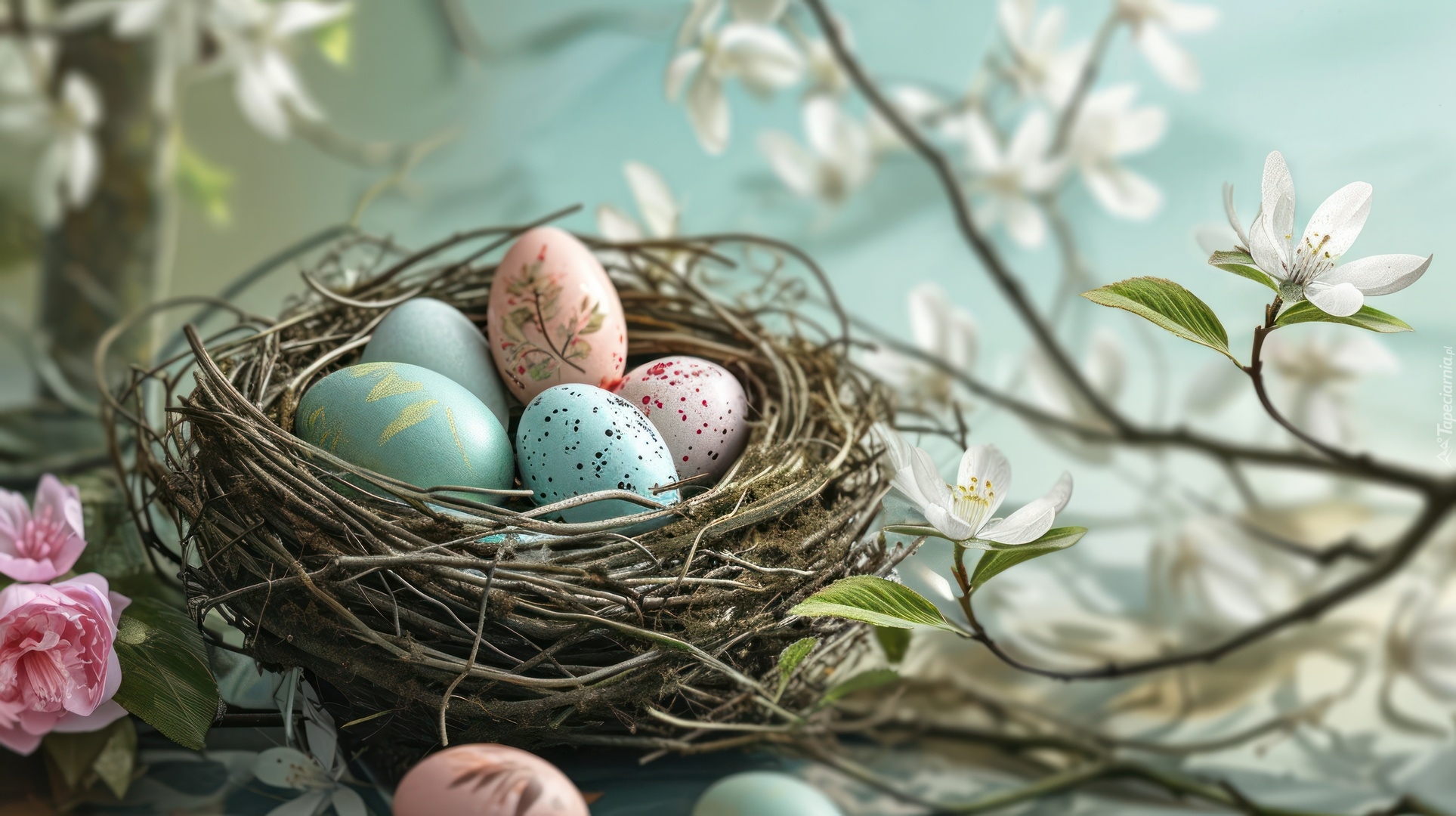 Edytor tapety: Nakrapiane pisanki w gniazdku i kwiaty na gałązkach