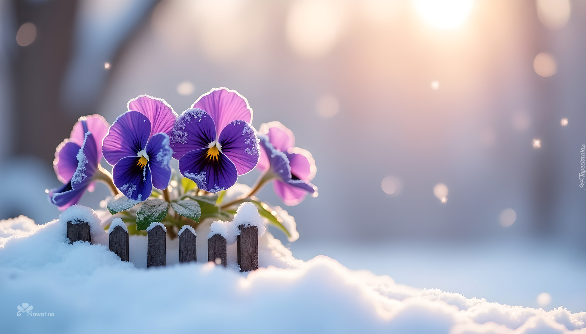 Edytor tapety: Fioletowe bratki i drewniany płotek zasypany śniegiem
