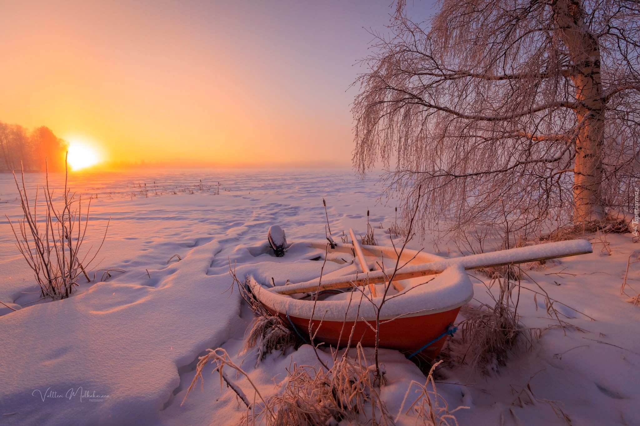 Edytor tapety: Zaśnieżona łódka obok brzozy