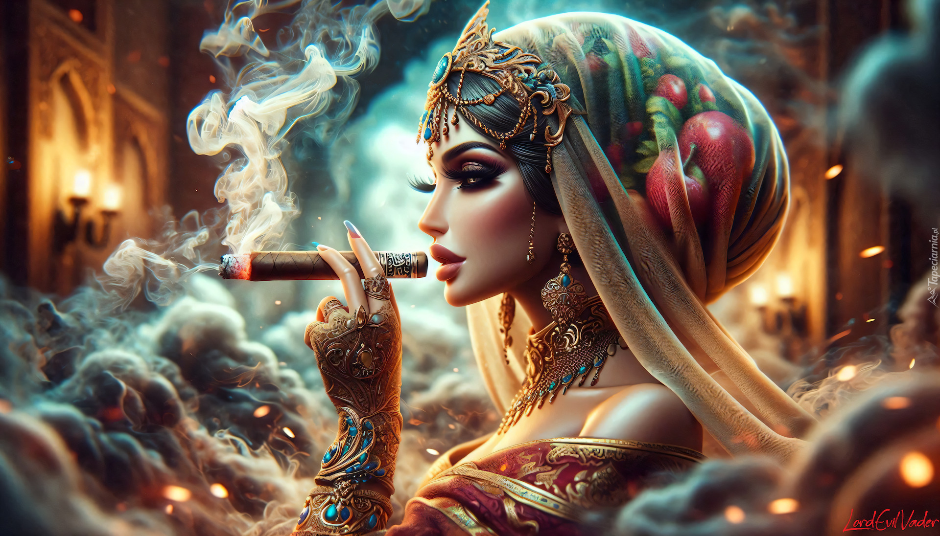 Edytor tapety: Kobieta w kolorowej chuście na głowie paląca cygaro
