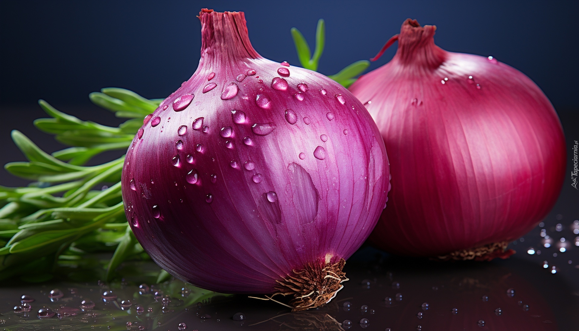 Edytor tapety: Krople na dwóch czerwonych cebulach