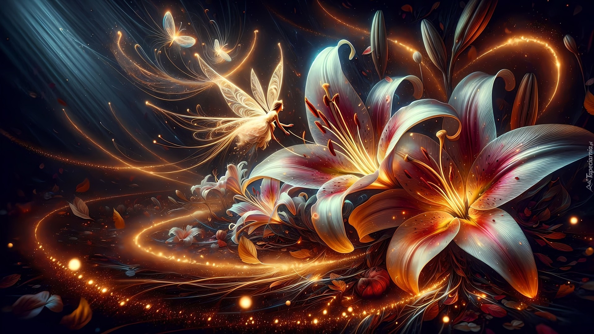 Edytor tapety: Rozświetlone dwie rozwinięte lilie w grafice