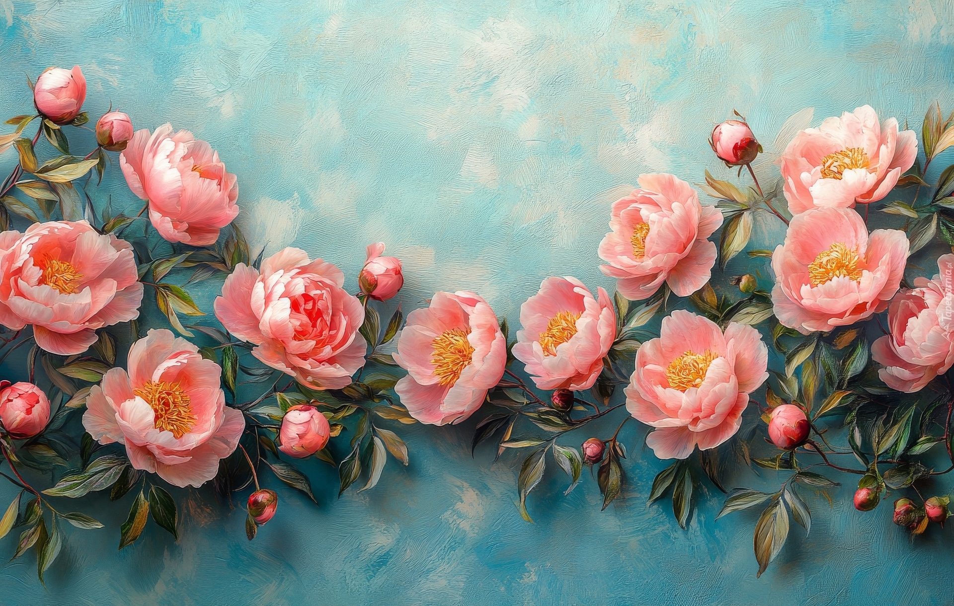 Edytor tapety: Rozkwitnięte różowe piwonie z pąkami na niebieskim tle