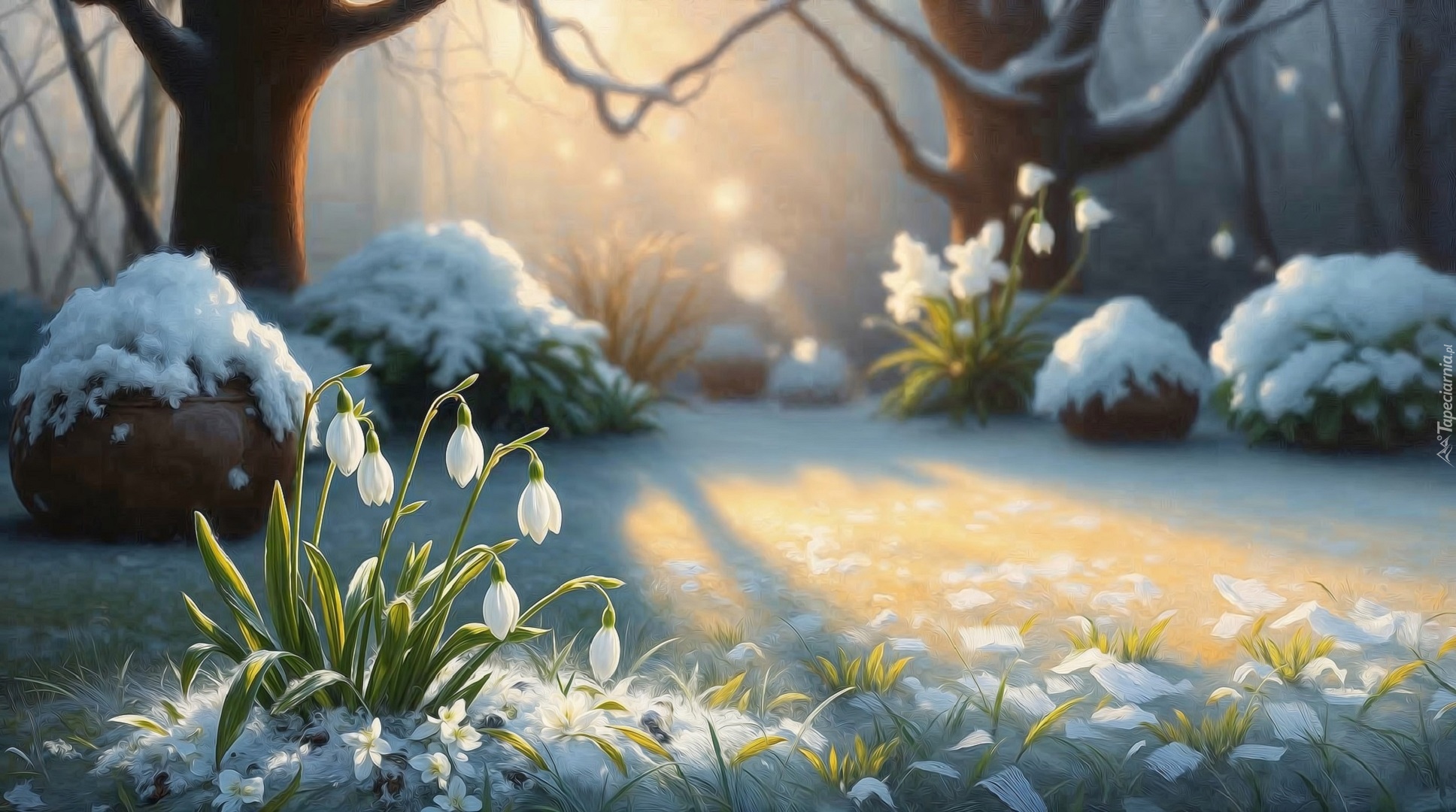 Edytor tapety: Grafika z kępką przebiśniegów i drzewami w oddali