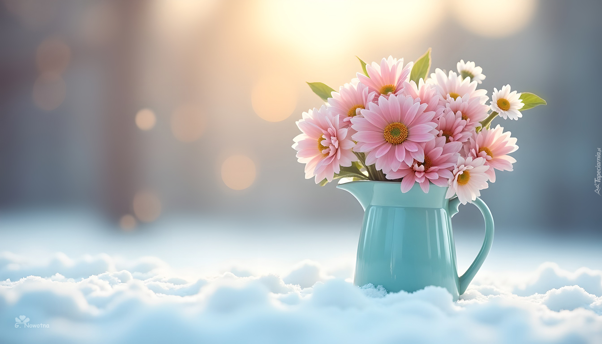 Edytor tapety: Różowe kwiaty w zielonym dzbanku na śniegu