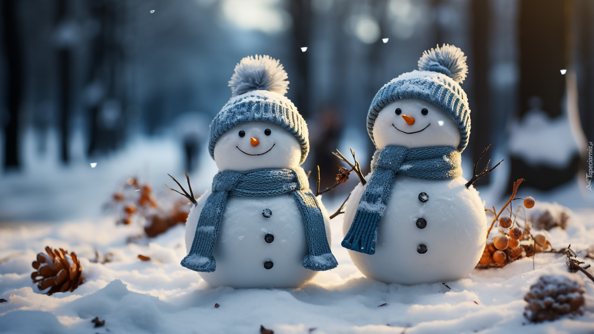 Edytor tapety: Dwa uśmiechnięte bałwanki w czapkach i szalikach
