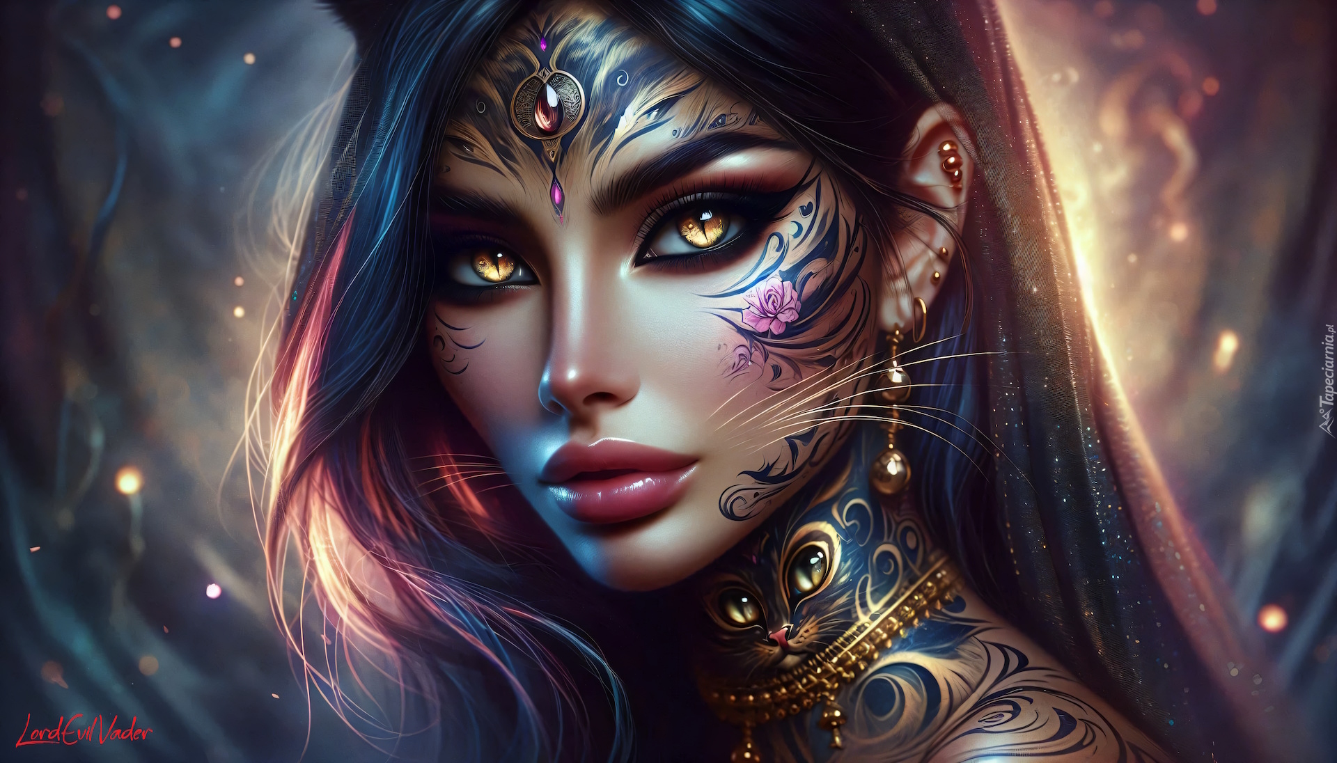 Edytor tapety: Długowłosa kobieta z biżuterią i tatuażami