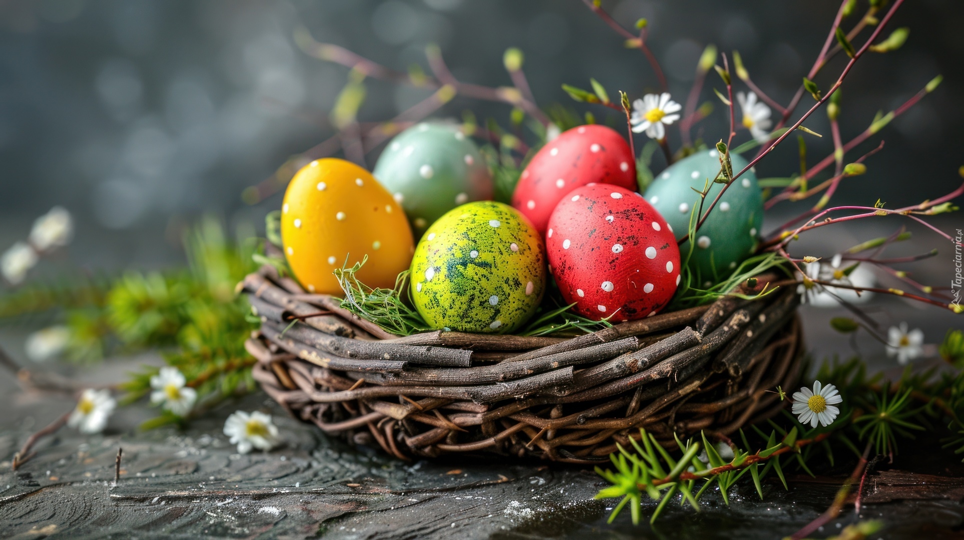 Edytor tapety: Białe drobne kwiaty obok kolorowych pisanek w gniazdku