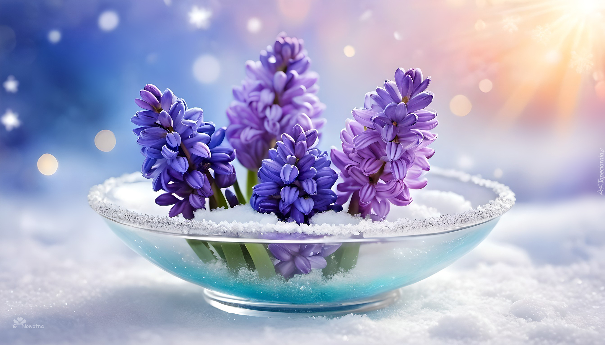 Edytor tapety: Fioletowe hiacynty w ośnieżonym szklanym naczyniu na śniegu